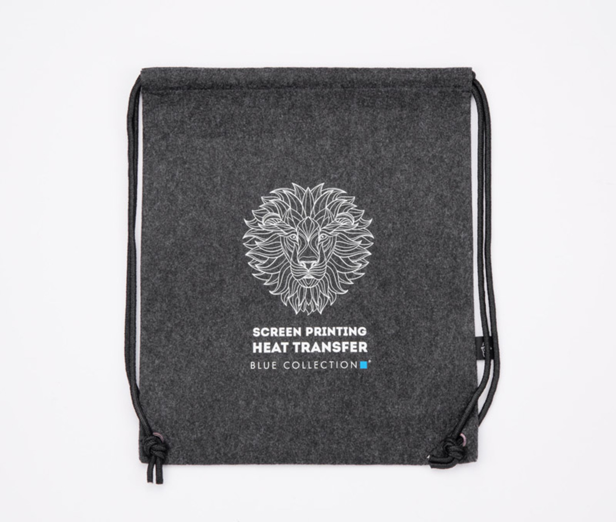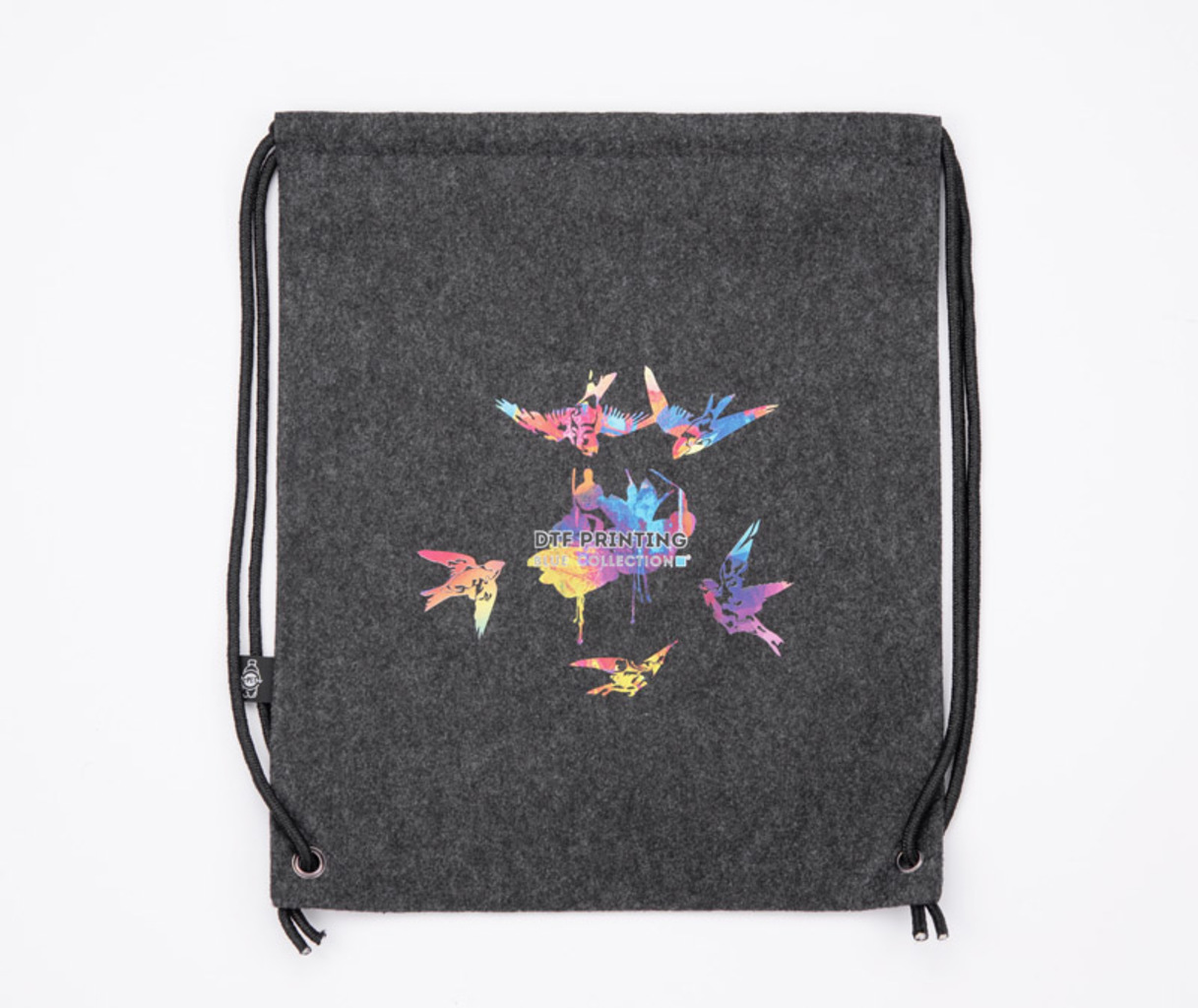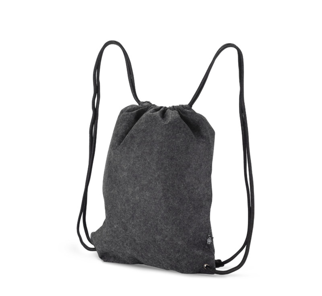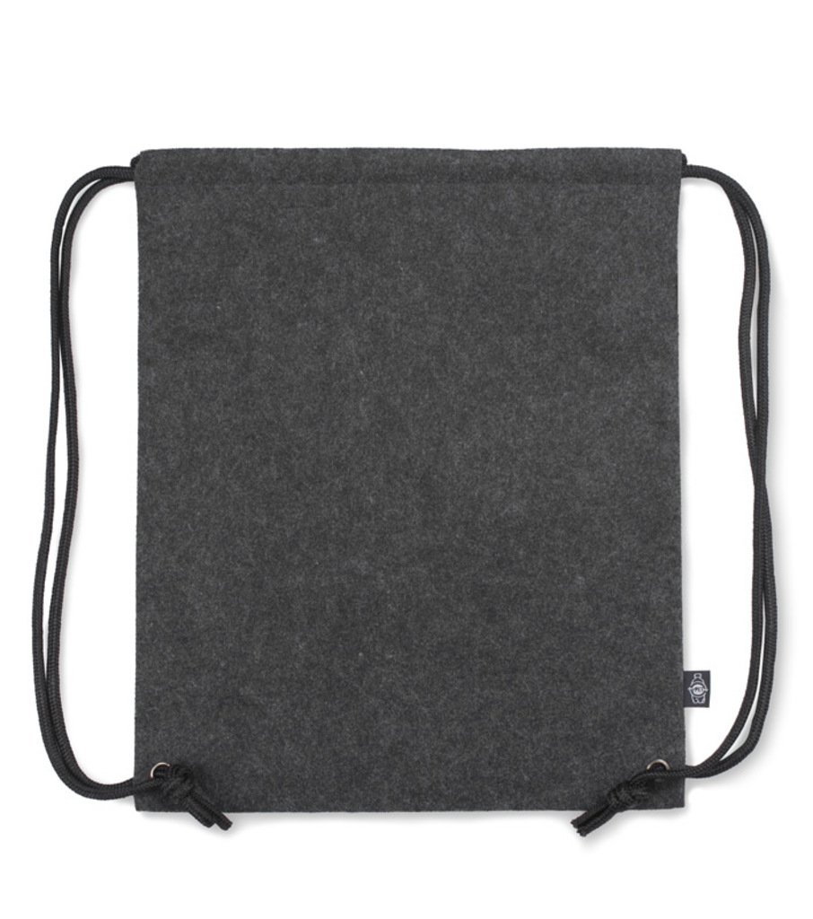Taška DENGY vyrobená z recyklované rPET plsti v grafitové, neutrální barvě. V kombinaci s černými provázky a rukojetí vypadá nesmírně zajímavě.