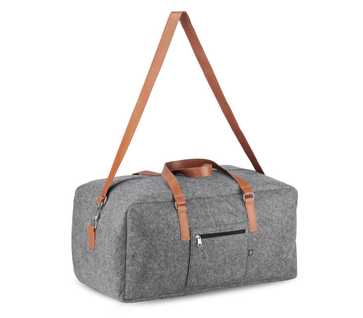 FELT2GO je lehká a prostorná plstěná cestovní taška s prvky z materiálu podobného kůži (PU). Má dvě dlouhá elegantní ucha a připojený popruh na nošení. Na vnější straně je jedna kapsa na zip. Vyrobeno z recyklované plsti rPET.