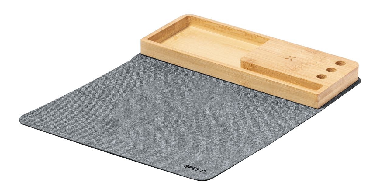 Skládací polyesterová podložka pod myš RPET se silikonovou základnou. S vestavěnou bezdrátovou rychlonabíječkou (15W) a bambusovým držákem mobilního telefonu. Polyester 300D RPET. Včetně USB nabíjecího kabelu.