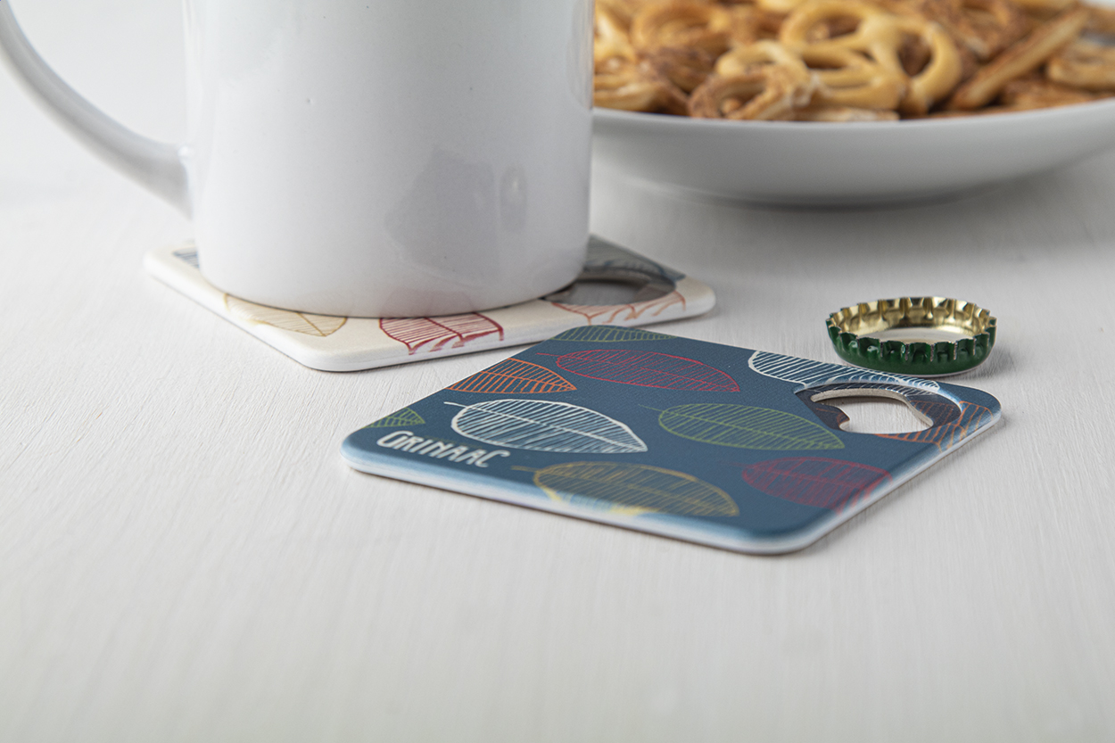Plastový podtácek s kovovým otvírákem na láhve a protiskluzovým spodkem.