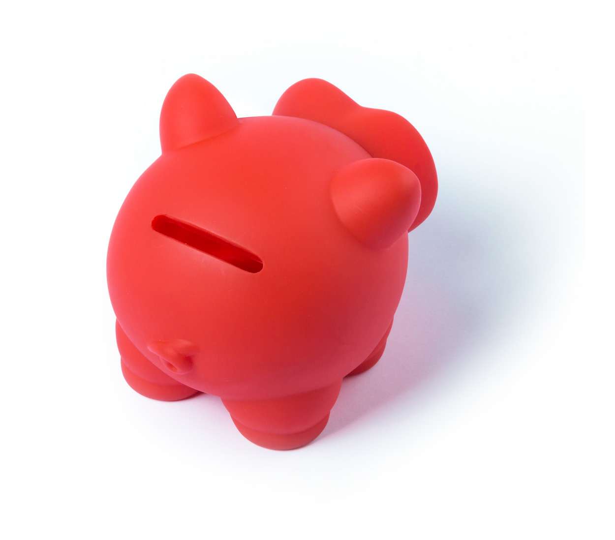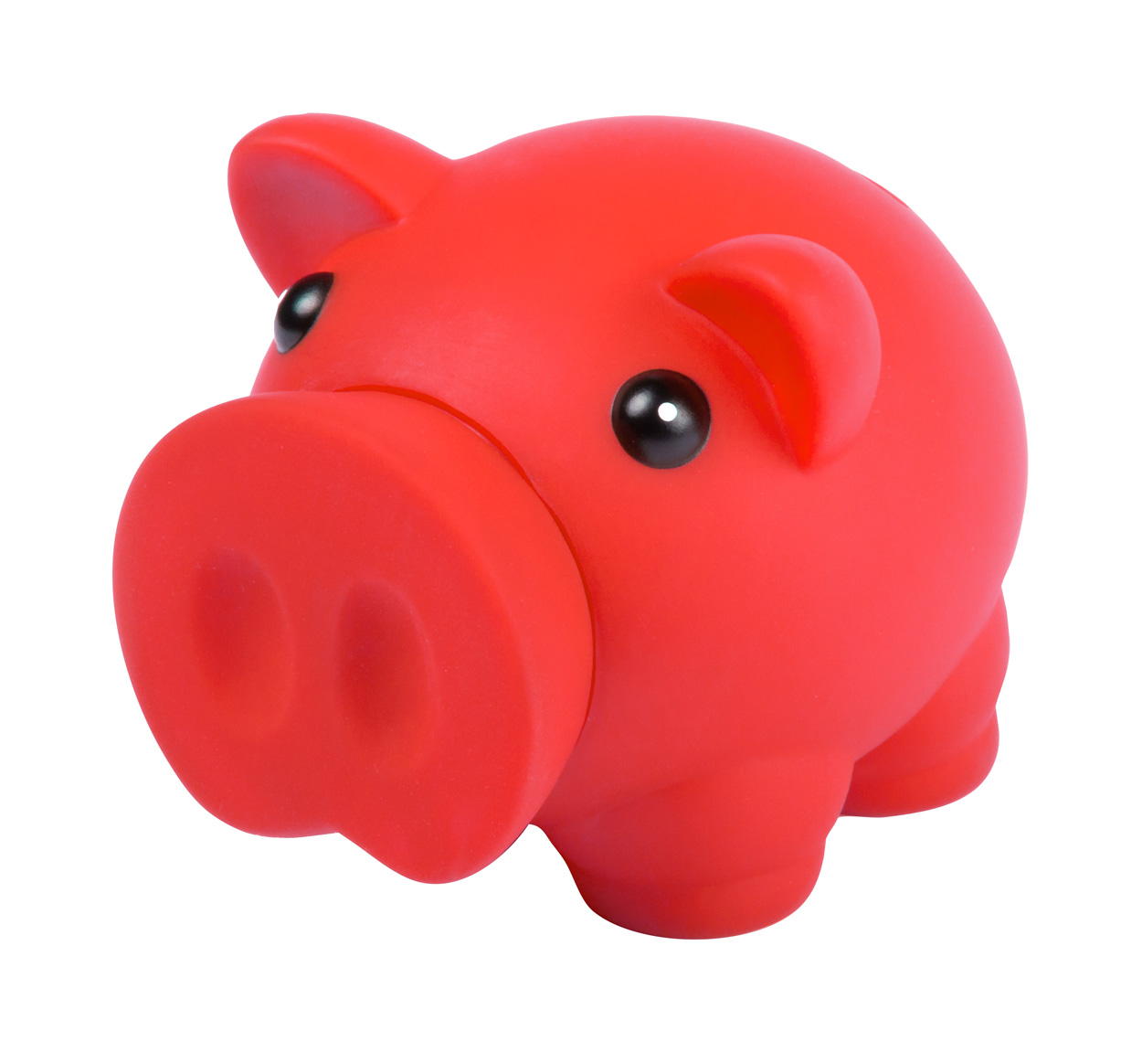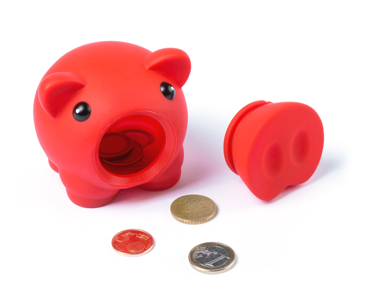Plastová pokladnička prasátko, s oddělitelným rypáčkem pro otevření.