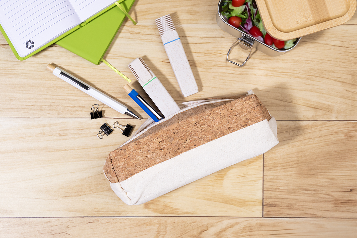 Pouzdro na pera na zip z přírodního korku a bavlny s barevně odpovídajícím bavlněným zipem.