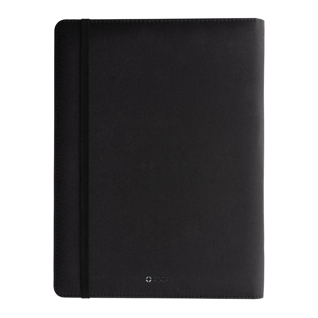 Portfolio značky Swiss Peak ve formátu A4 vyrobené z 300D recyklovaného polyesteru. Je vybaveno poutky na pera, sloty na vizitky, prostornou kapsou formátu A4. Obsahuje vyměnitelný poznámkový blok A4 s 20 stranami linkovaného krémového FSC® papíru (70g/m2). Vyrobeno ze 100 % recyklovaného polyesteru včetně skenovatelné složky AWARE™ garantující obsah recyklátu. Baleno v FSC® dárkové krabičce.