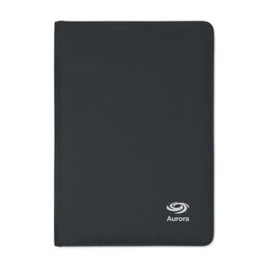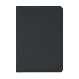 Portfolio A5 z materiálu 300D RPET. Vyměnitelný poznámkový blok A5. 40 bílých linkovaných stran z bambusového papíru (20 listů). Držák na propisku. Držáky na karty na vnitřní straně a jedna velká přihrádka.