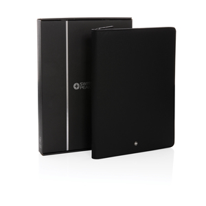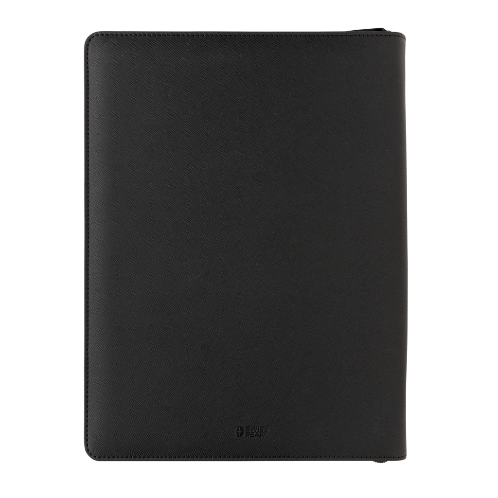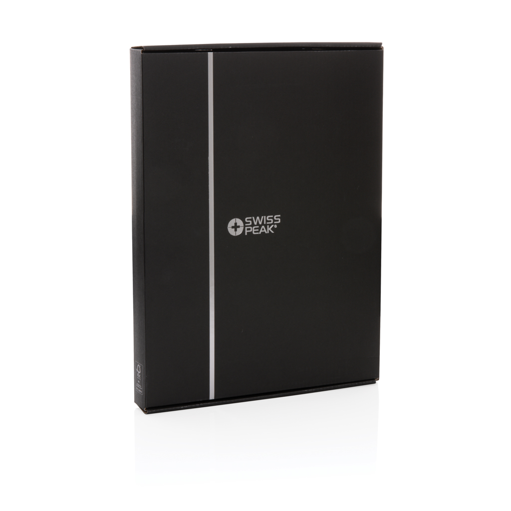 Kolekce Swiss Peak Heritage mluví jazykem moderní elegance. Obal portfolia je vyroben z ikonické italské recyklované PU kůže s RCS certifikací. RCS (Recycled Claim Standard) je globální standard, který umožňuje ověřit použití recyklovaného materiálu v produktu napříč celým dodavatelským řetězcem. Obsahuje stojánek na telefon/tablet, sloty na vizitky nebo karty, kapsu na drobnosti a na poznámky, poutko na pera a prostor na zápisník. Zápisník je vyroben z kamenného linkovaného papíru s 20 stranami. Celkový podíl recyklátu dle váhy produktu: 9 %. Bez PVC.