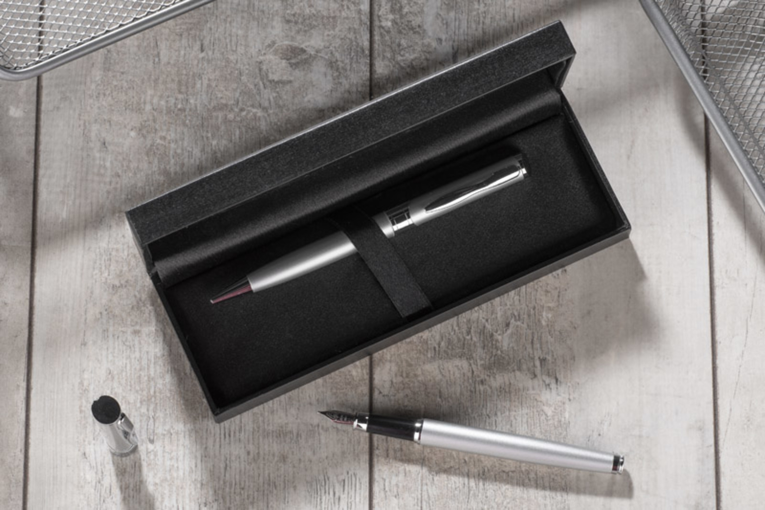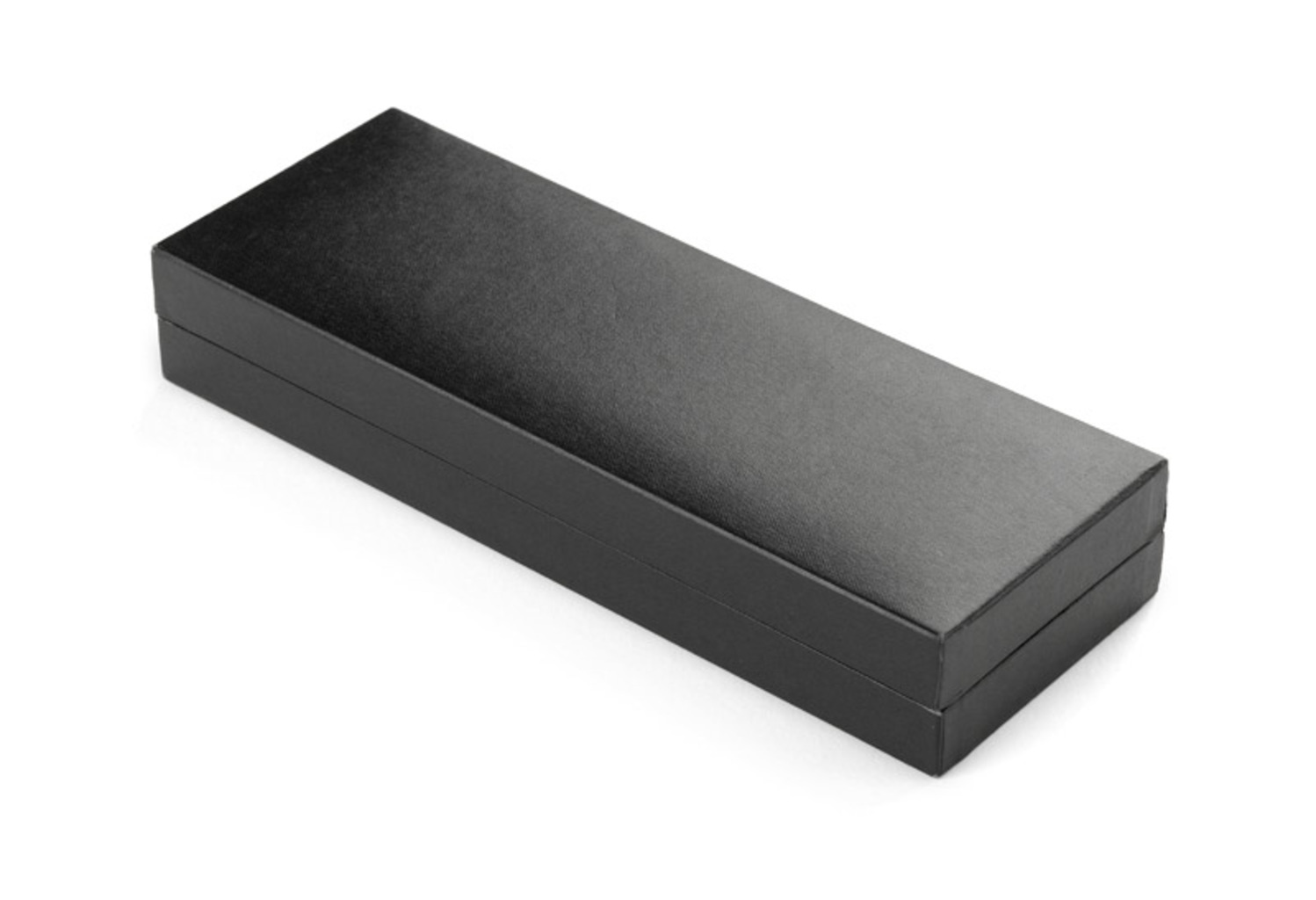 Elegantní krabička z černého plastu a s černou výplní. Může pojmout dva psané články. Vyhovuje všem typům pera.