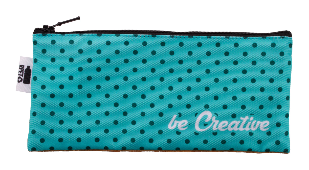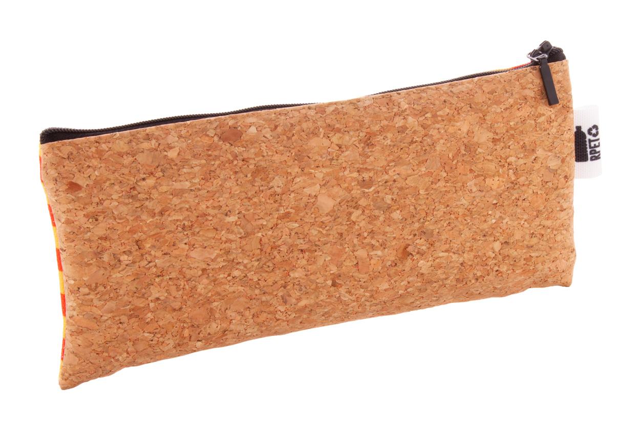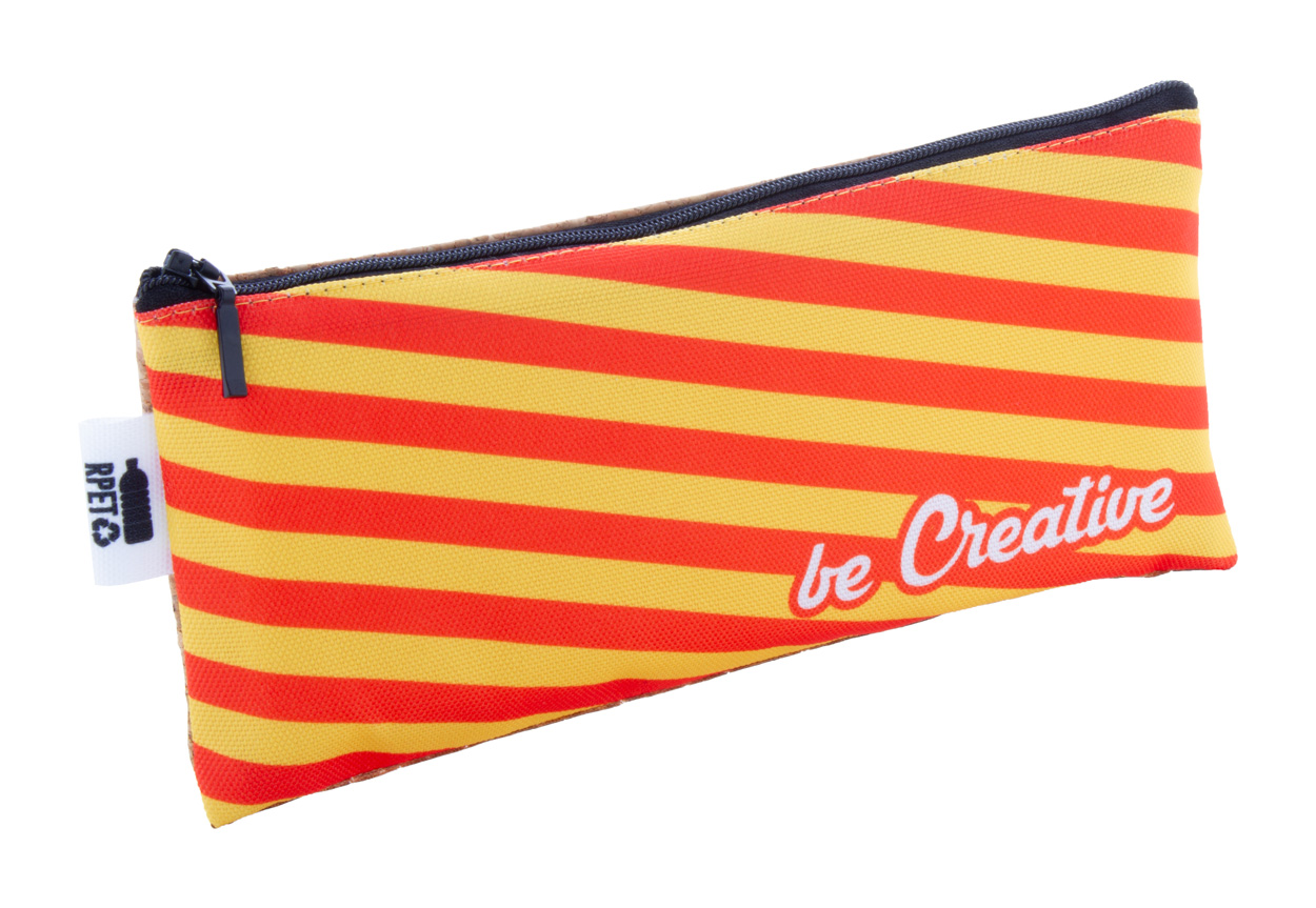 Na zakázku vyrobené pouzdro na pera na zip z 600D RPET polyesteru s přírodním korkem. S celoplošně tištěnou sublimační grafikou a výrazným štítkem RPET, cena nezahrnuje tiskovou přípravu. Min. mn.: 50 ks.