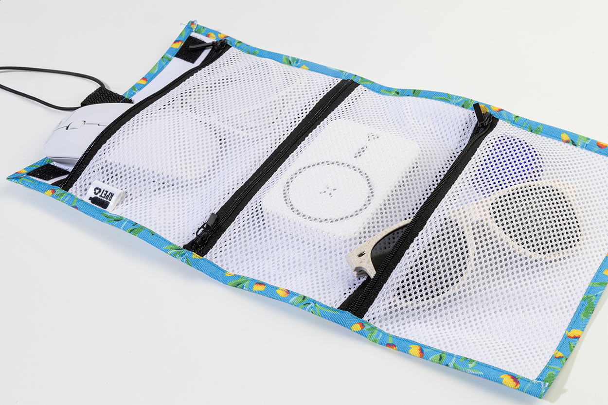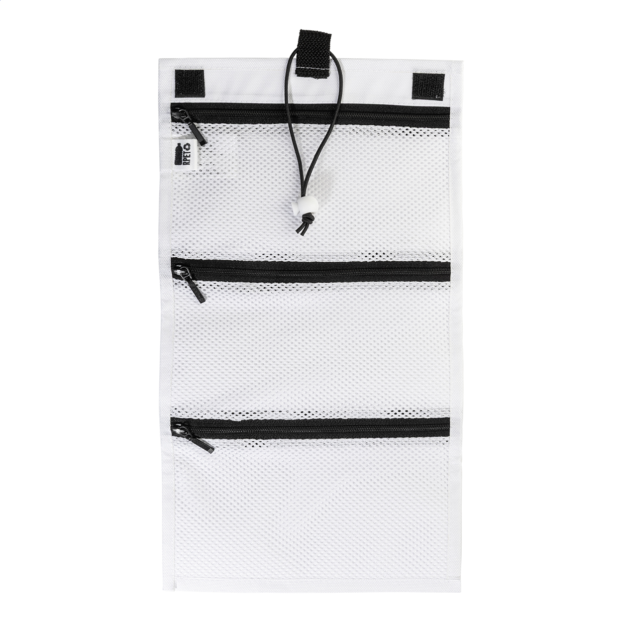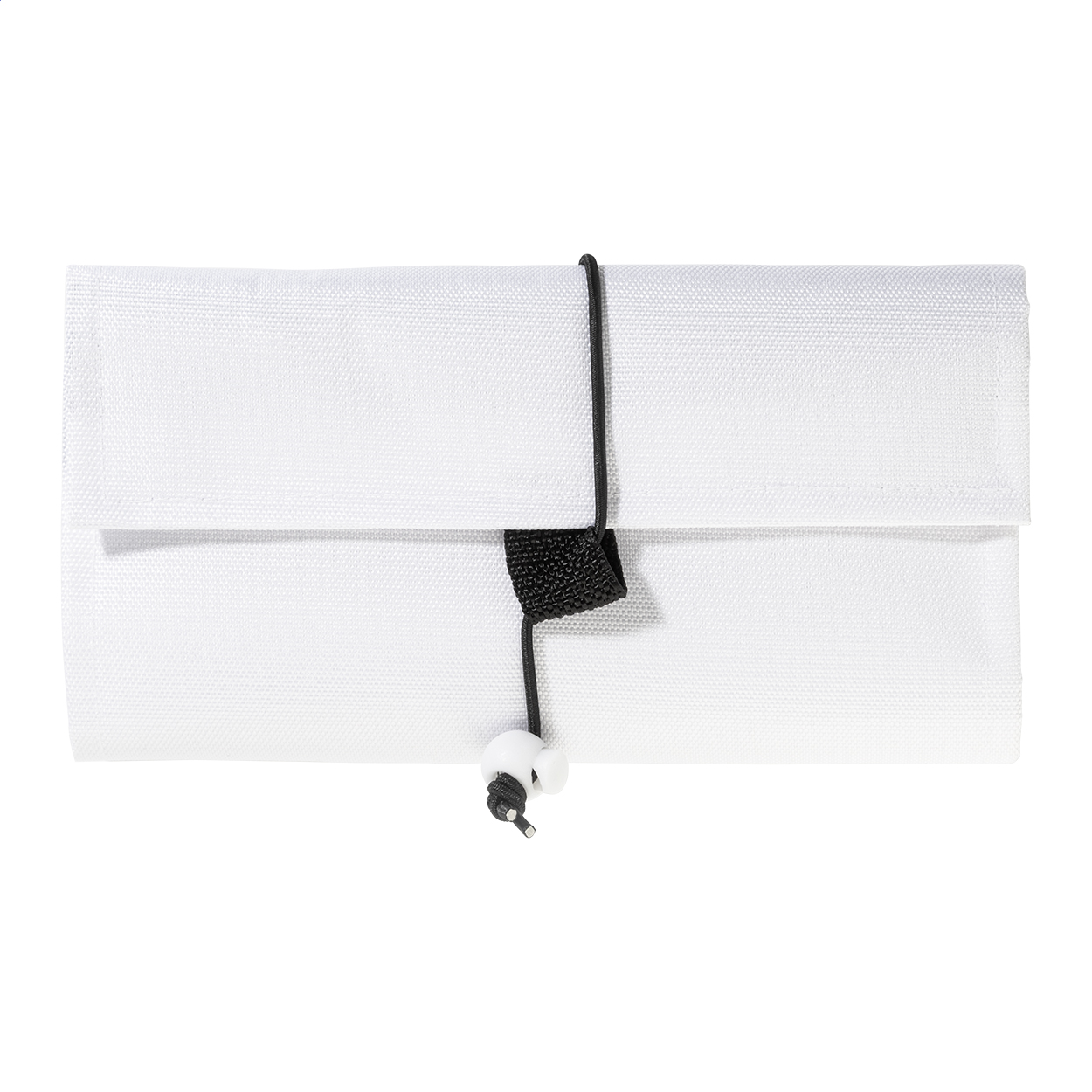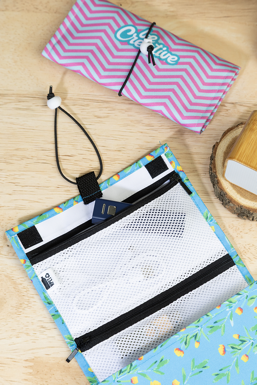 Rolovací brašna na kabely na zakázku z RPET s 3 síťovanými kapsami na zip a elastickým zapínáním. S celoplošným sublimačním potiskem. 600D RPET polyester s výrazným RPET štítkem. Cena nezahrnuje tiskovou přípravu. Min. mn.: 25 ks.