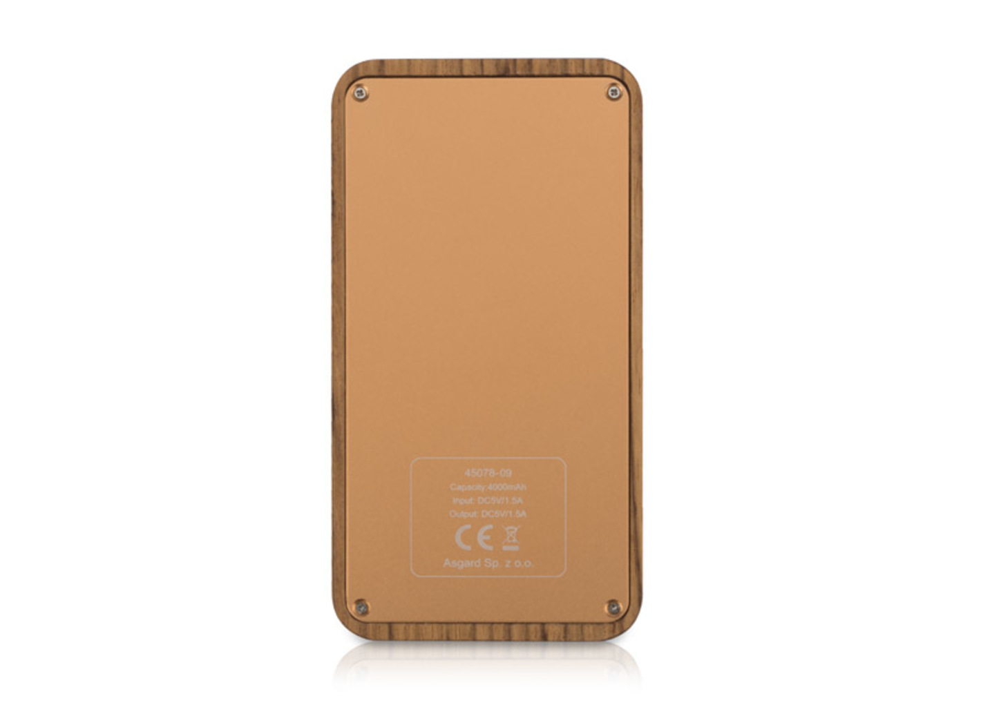 Power banka pro milovníky ekologických produktů. Ochranný kryt je nahrazený přírodním materiálem, kterým je dřevo. Vybavená USB portem a ukazatelem úrovně energie. V kompletu standardní kabel micro USB pro nabíjení a návod k obsluze. Výrobek je v souladu s vhodnými směrnicemi Evropské Unie, opatřený značkou CE a 1 rokem záruky. Technické údaje: - vstup: 5 V / 1,5 A (port micro USB)- výstup: 5 V / 1,5 A - kapacita baterie: 4 000 mAh.