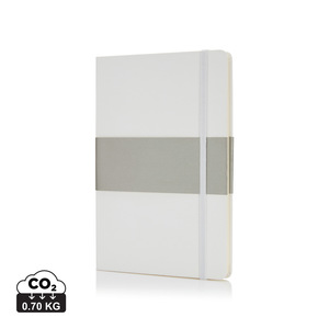 Formát A5, elastická gumička, křídový papír na předním a zadním přebalu, oblé rohy, vnitřní stránky v krémové barvě s černými linkami, 160 listů s gramáží 80 g, černá záložka.