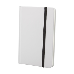 Poznámkový blok s bílými deskami, 80 čistými listy a barevnou gumičkou.