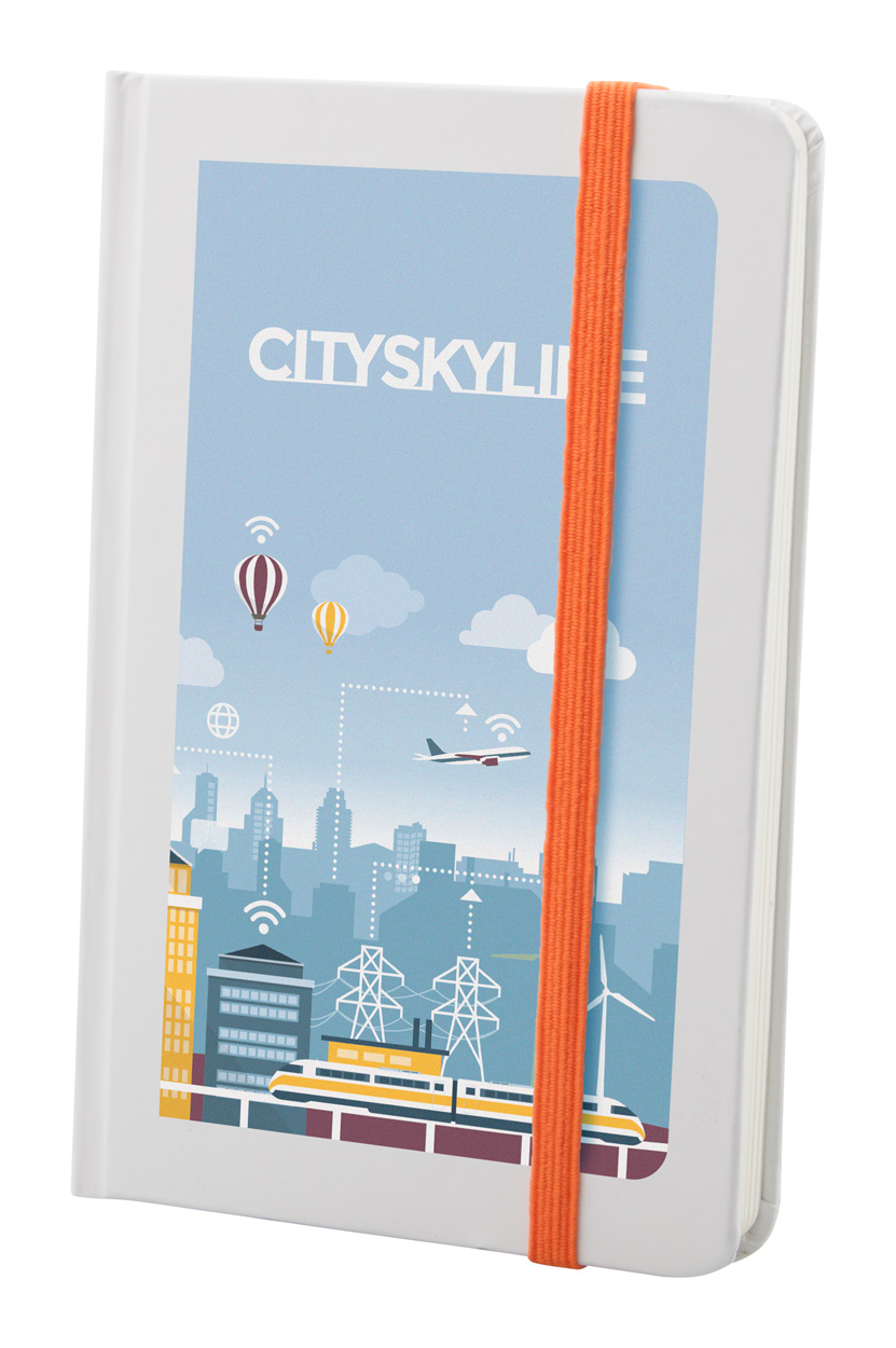 Poznámkový blok s bílými deskami, 80 čistými listy a barevnou gumičkou.