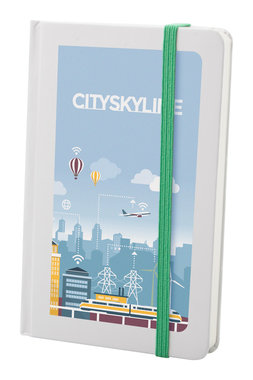 Poznámkový blok s bílými deskami, 80 čistými listy a barevnou gumičkou.