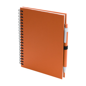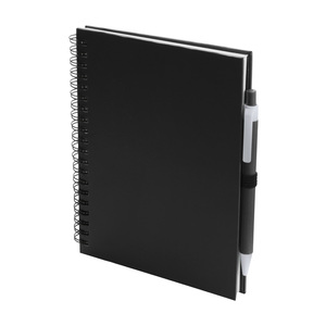 Poznámkový blok se 70 čistými listy a spirálovou vazbou v kartonových deskách, vč. stejně barevného kuličkového pera z recyklovaného papíru s modrou náplní.