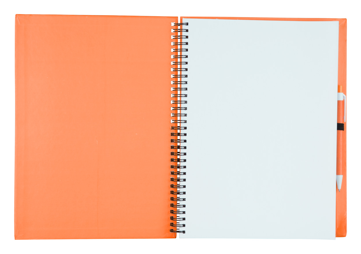 Poznámkový blok A5 s 80 čistými listy a spirálovou vazbou v kartonových deskách, vč. stejně barevného kuličkového pera z recyklovaného papíru s modrou náplní.
