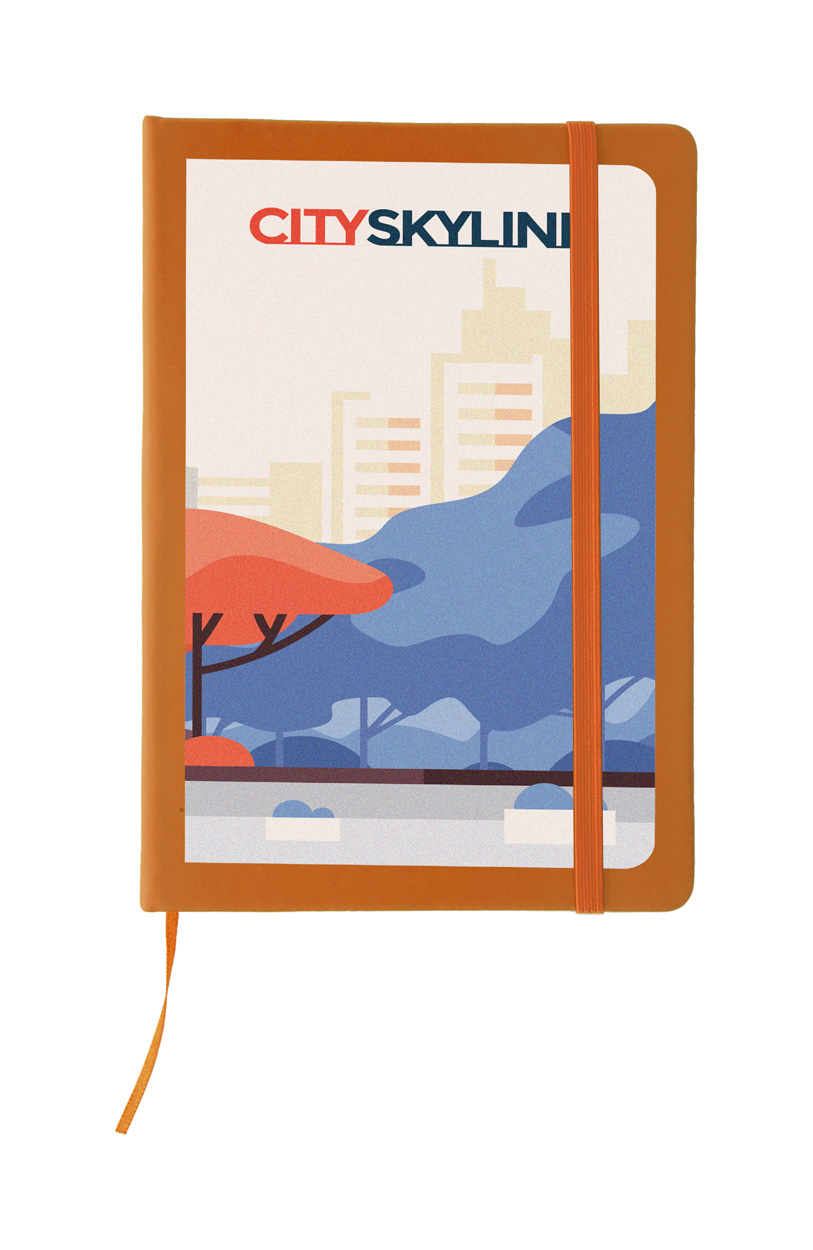 Poznámkový blok se 100 listy, záložkou a gumičkou.