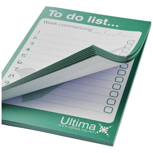Bílý poznámkový blok A6 Desk-Mate®. Obsahuje listy čistého papíru 80 g/m2. Standardně se dodávají v balení po 50 listech, dostupné také po 25 nebo 100 listech. Dekorace je možná na všech listech. Rozměry listů: 105x148mm.
