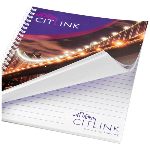 Spirálový poznámkový blok Desk-Mate® A4 Tento poznámkový blok obsahuje bílý nebo černý drát. Dostupné v různých velikostech. Obsahuje lesklé desky (250g/m2) a čistý papír (80g/m2). Standardně se dodávají v balení po 50 listech, dostupné také po 80 listech. Dekorace je možná na obálce a na každém listu.