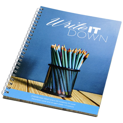 Spirálový poznámkový blok Desk-Mate® A5 Tento poznámkový blok obsahuje bílý nebo černý drát. Dostupné v různých velikostech. Obsahuje lesklé desky (250g/m2) a čistý papír (80g/m2). Standardně se dodávají v balení po 50 listech, dostupné také po 80 listech. Dekorace je možná na obálce a na každém listu.