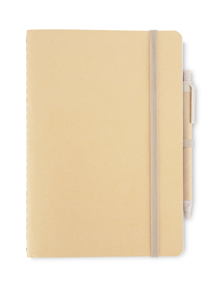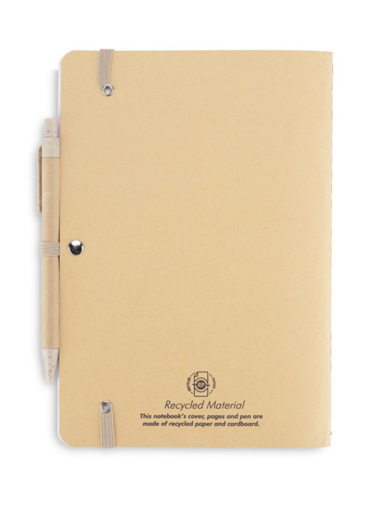 Zápisník REMATT v ekologickém obalu z recyklovaného papíru v klasické hnědé barvě. Zápisník je dodáván s kuličkovým perem s modrou náplní, jehož tělo je vyrobeno z recyklovaného papíru, s úpravou z pšeničné slámy. Zápisník se uzavírá gumičkou. Formát A5.