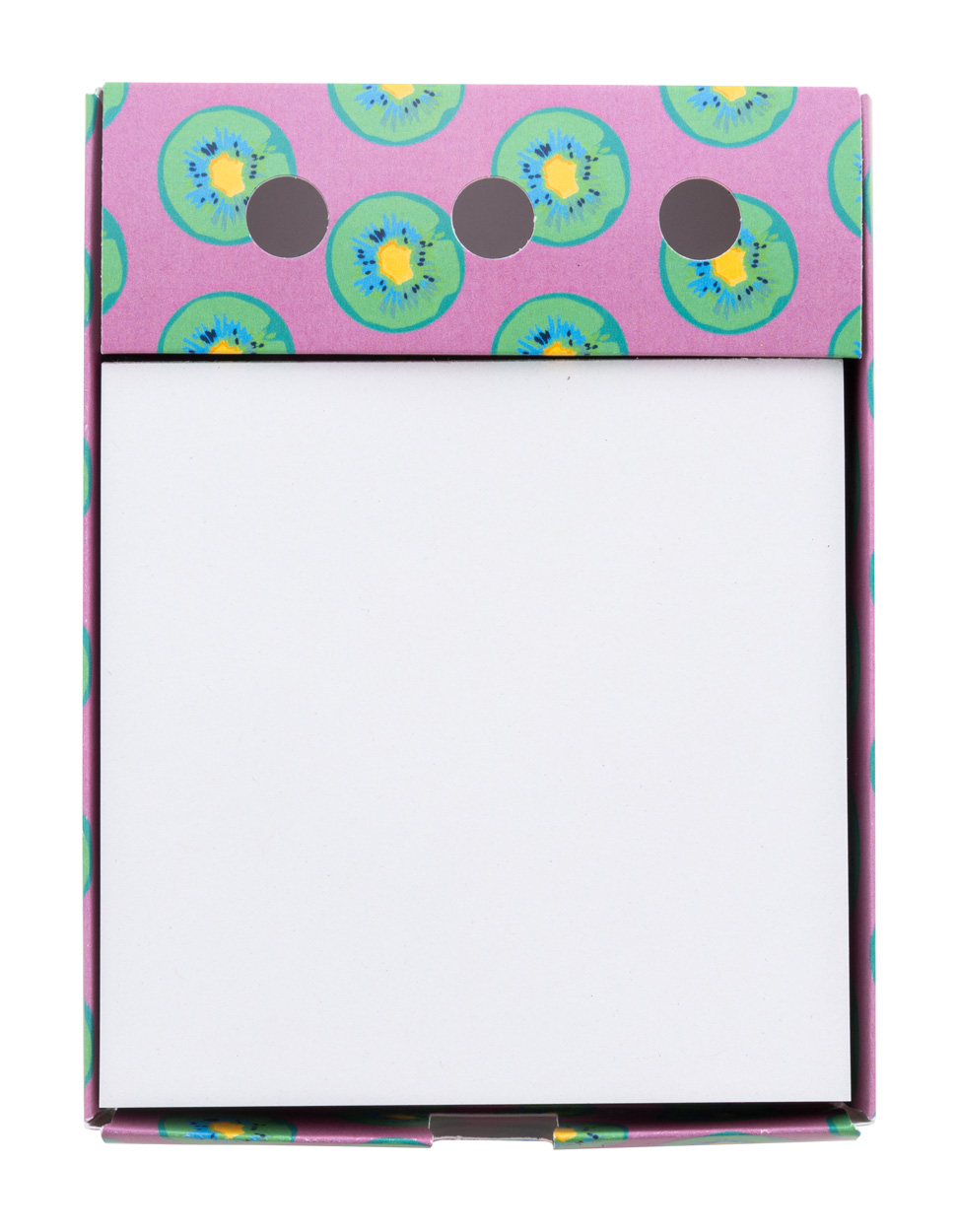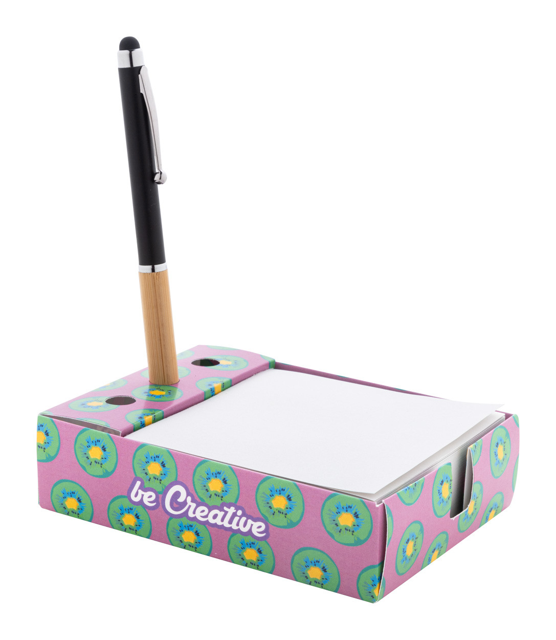 Na zakázku vyrobený držák na pera a zásobník na poznámky s 300 listy poznámkového bloku z recyklovaného papíru (90 × 90 mm). Cena zahrnuje plnobarevný potisk držáku. MOQ: 100 ks.