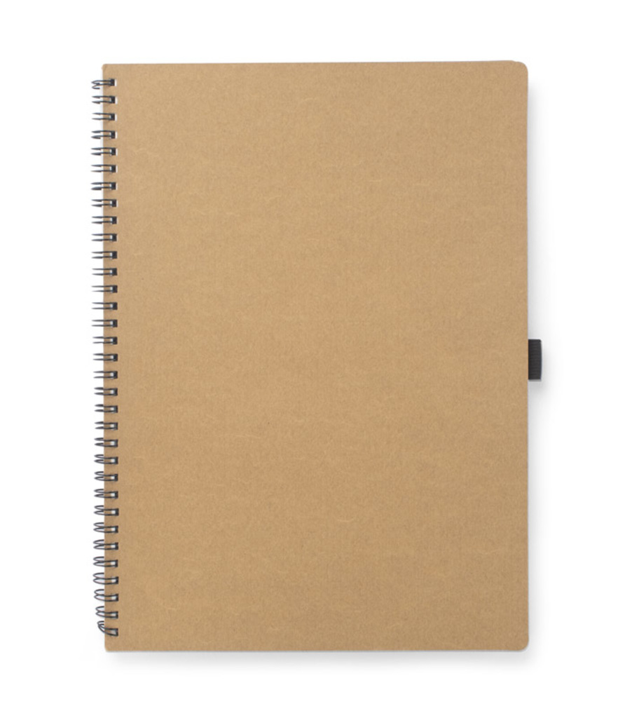 Klasický spirálový zápisník s hnědou papírovou obálkou a místem na pero. Stránky v zápisníku jsou vyrobeny z kamenného papíru. Tento papír je mimořádně trvanlivý a odolný vůči vlhkosti. Zápisník má 60 linkovaných listů, formát A4. Baleno v biologicky rozložitelném sáčku.