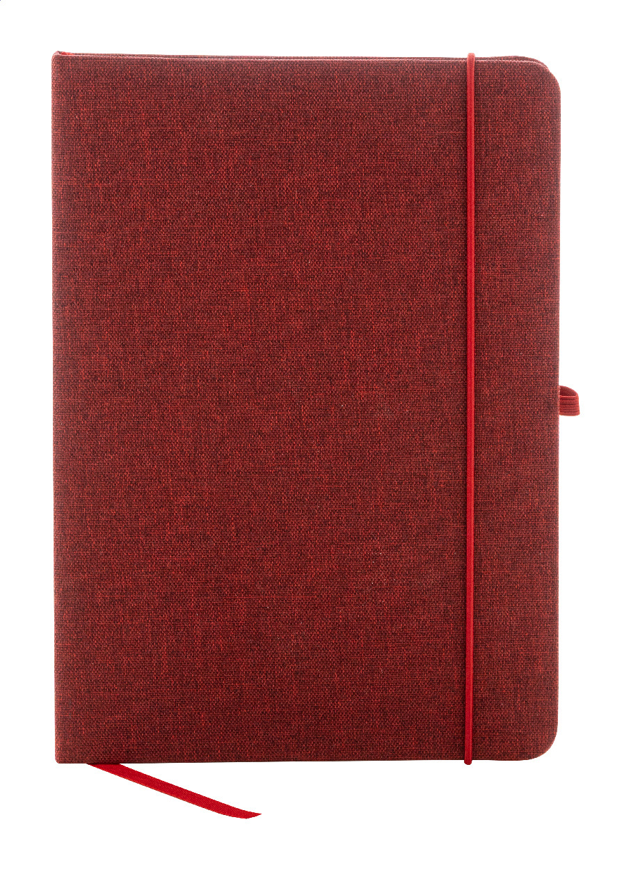 Blok A5 potažený polyesterem 300D RPET s 80 čistými listy. S gumovým páskem, záložkou a držákem na pero.