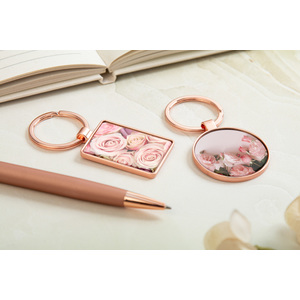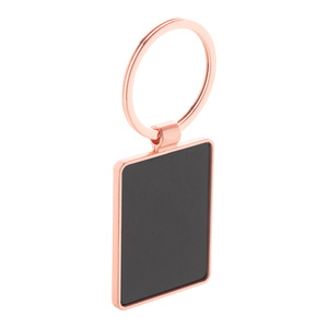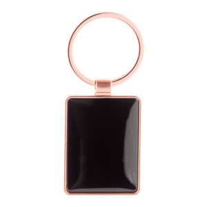Kovový přívěsek na klíče obdélníkového tvaru ve zlatém provedení s bronzovým plátem. V kraftové papírové krabici.