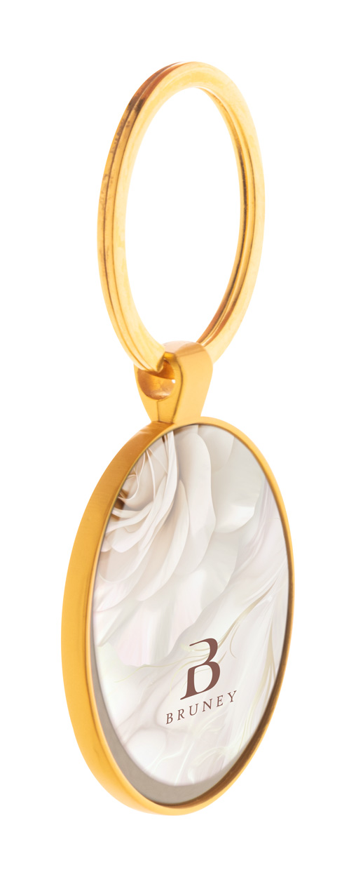 Kulatý kovový přívěsek na klíče ve zlatém provedení s bronzovým plátem. V kraftové papírové krabici.