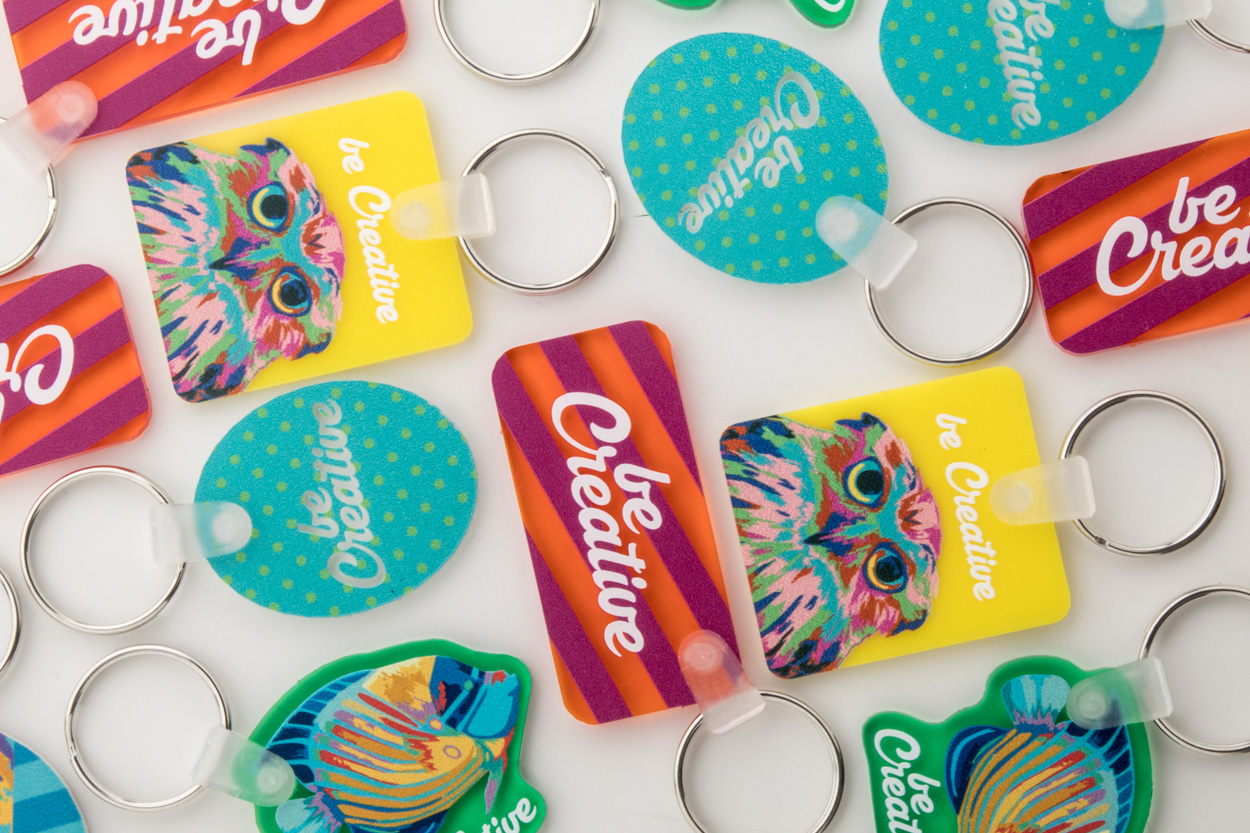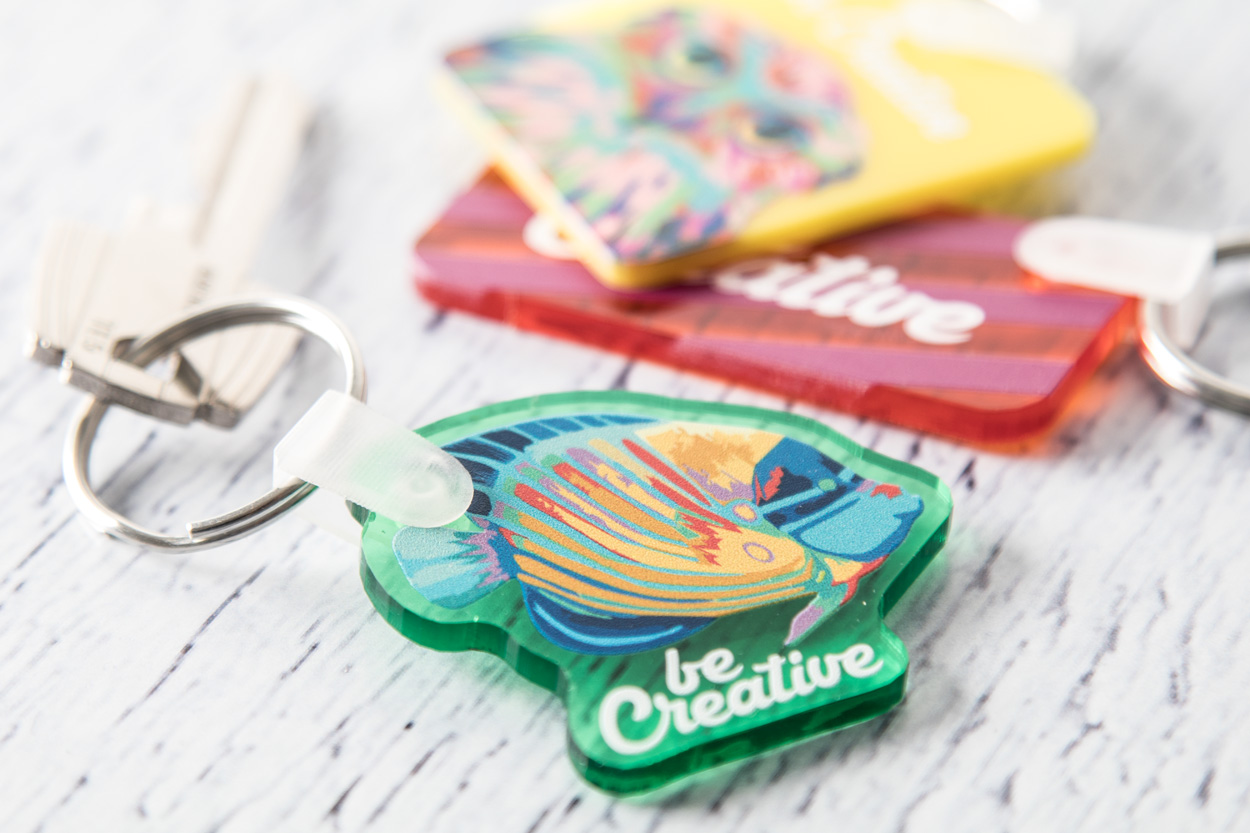 Akrylátový přívěšek na klíče na zakázku s plnobarevným potiskem. Tvar na zakázku - max. rozměr 45x45 mm. Cena zahrnuje UV LED tisk na 1 straně. Min. mn.: 250 ks.