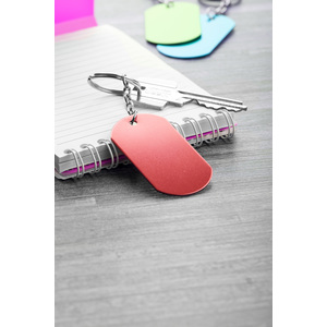 Hliníkový přívěšek na klíče s kovovým kroužkem.
