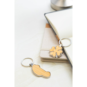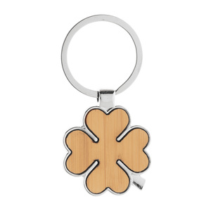 Kovový přívěšek na klíče ve tvaru čtyřlístku s bambusovou vložkou. V kraftové papírové krabičce.