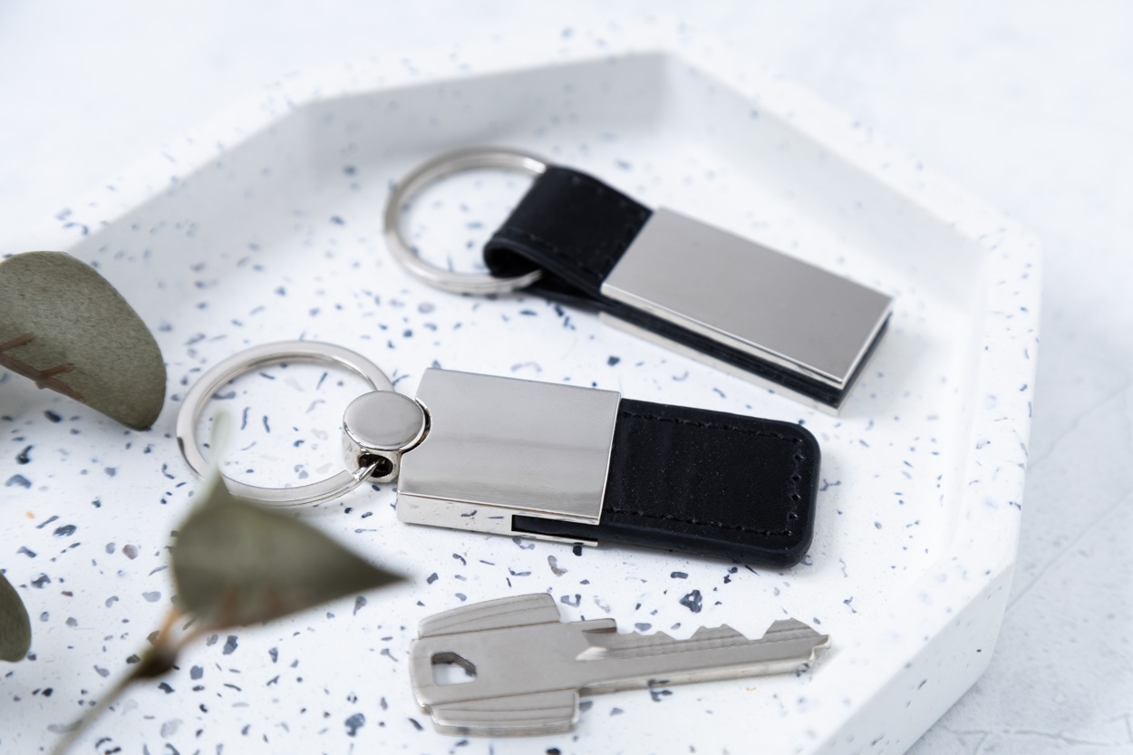 Přívěšek na klíče z kovu a PU kůže. V kraftové papírové krabičce.