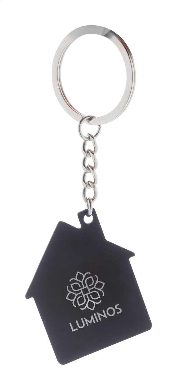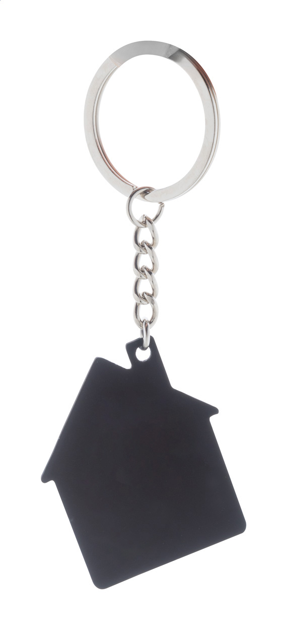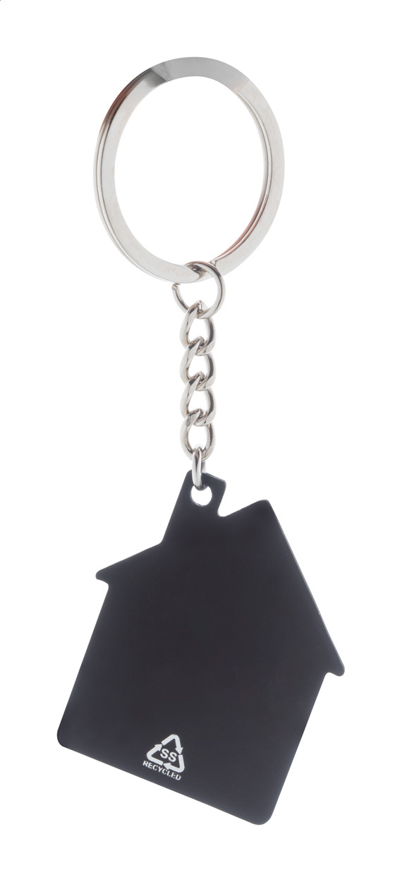 Přívěšek na klíče z recyklované nerezové oceli ve tvaru domečku s pogumovaným povrchem. Se speciální vrstvou pro zrcadlové laserové gravírování.