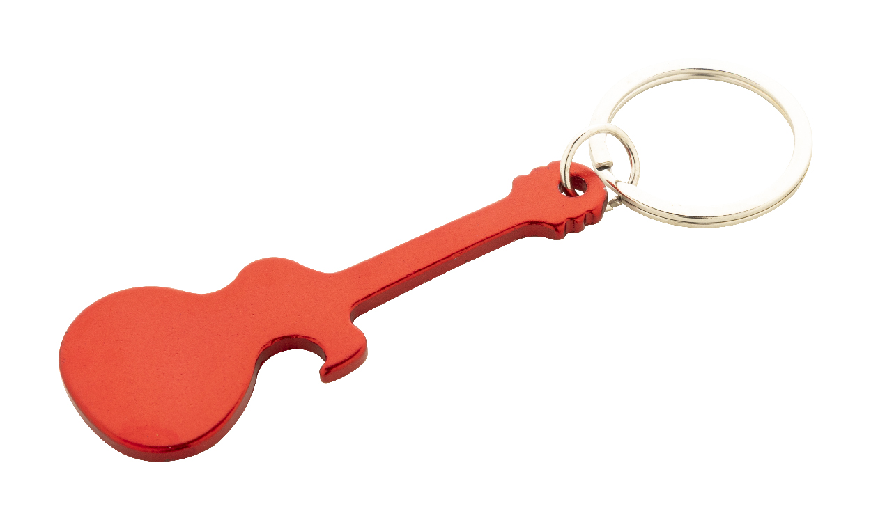 Hliníkový přívěšek na klíče ve tvaru kytary s otvírákem.