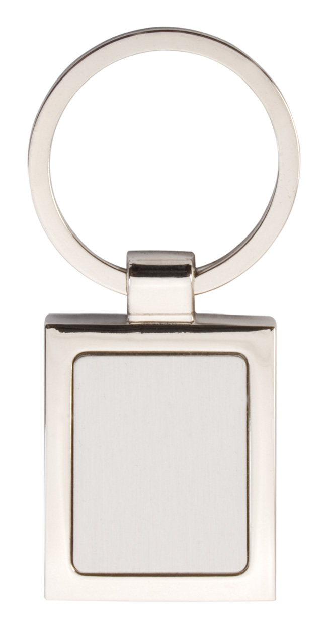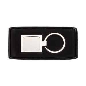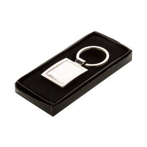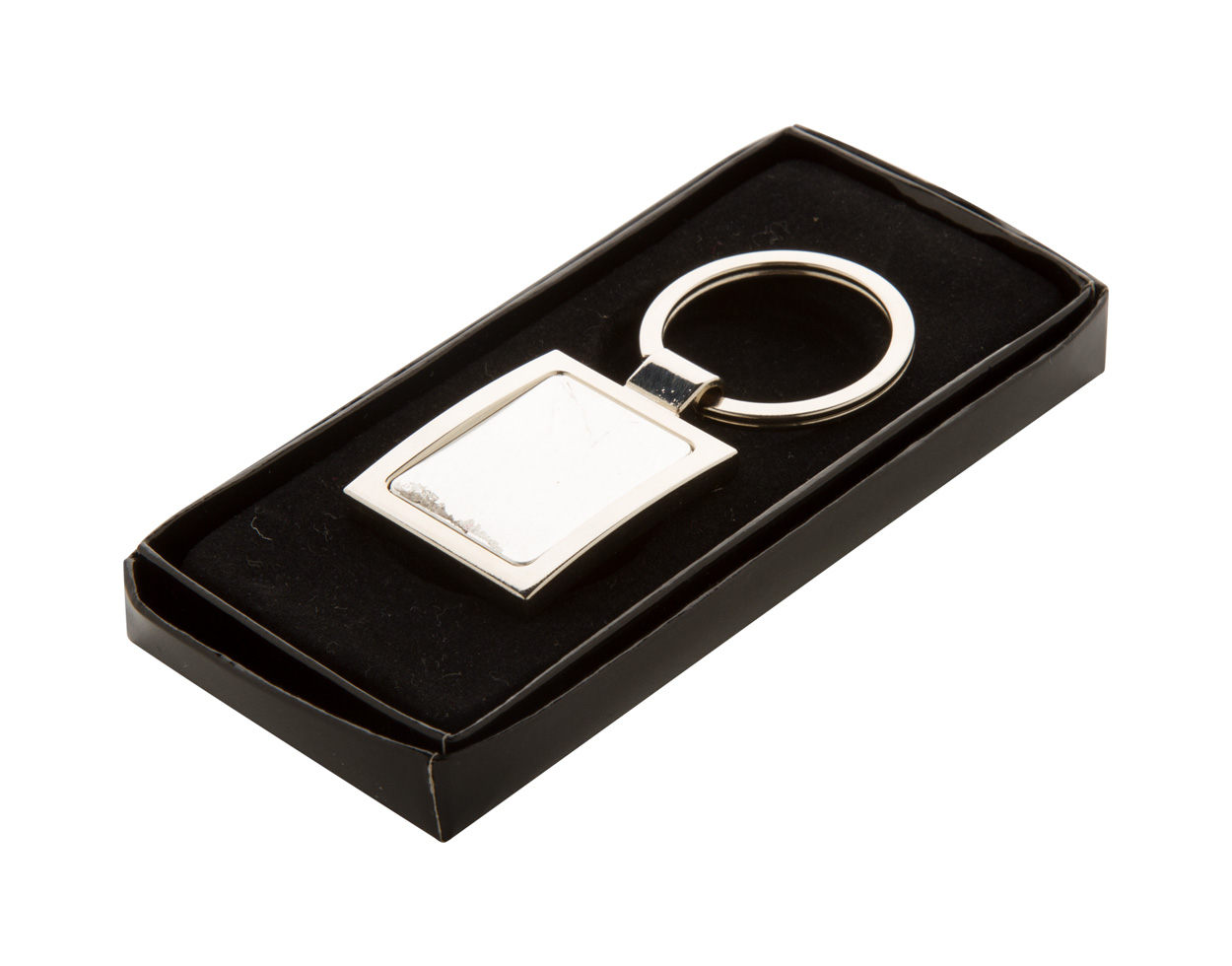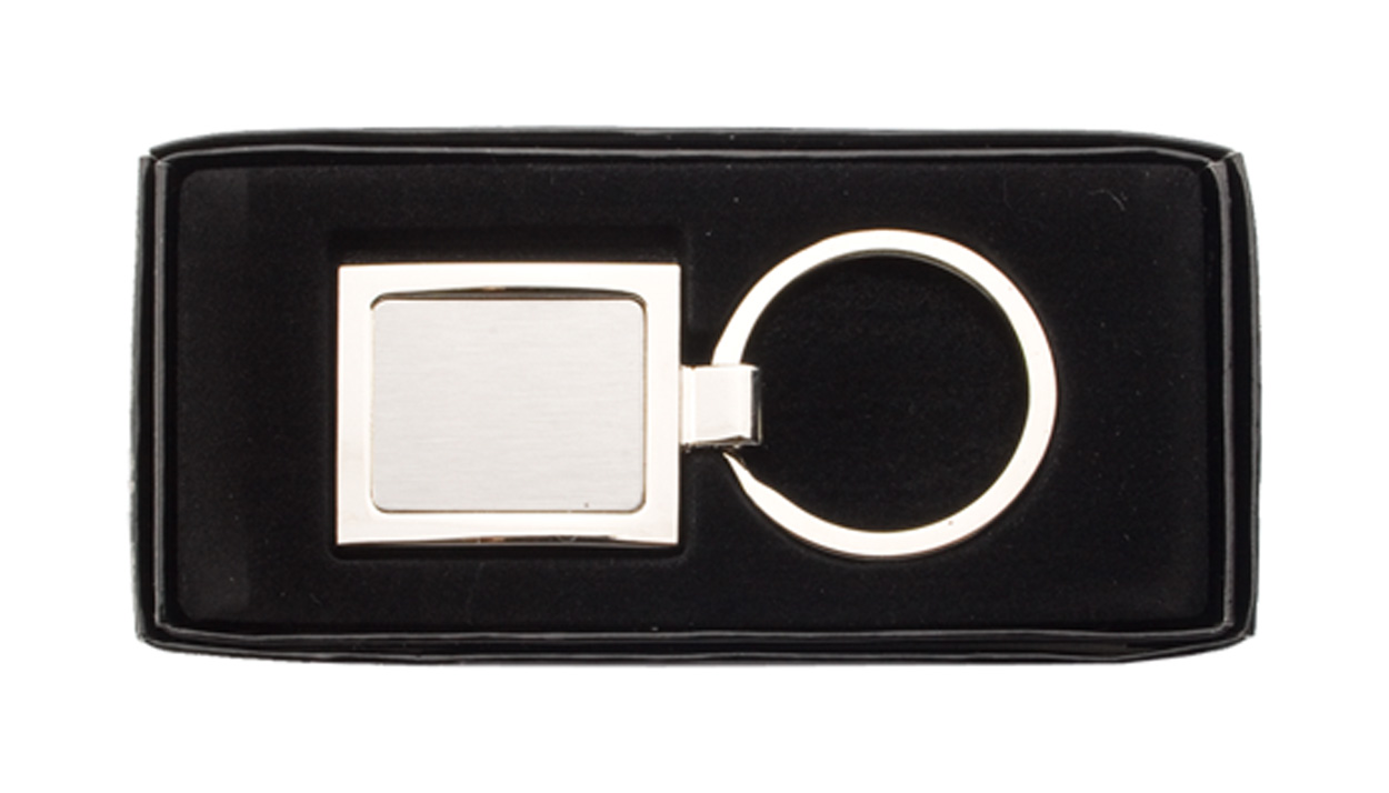 Kovový přívěšek na klíče v krabičce z černého kartonu.