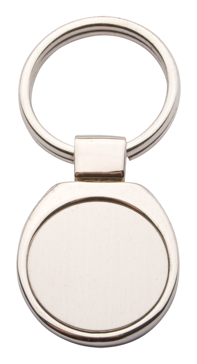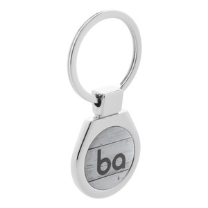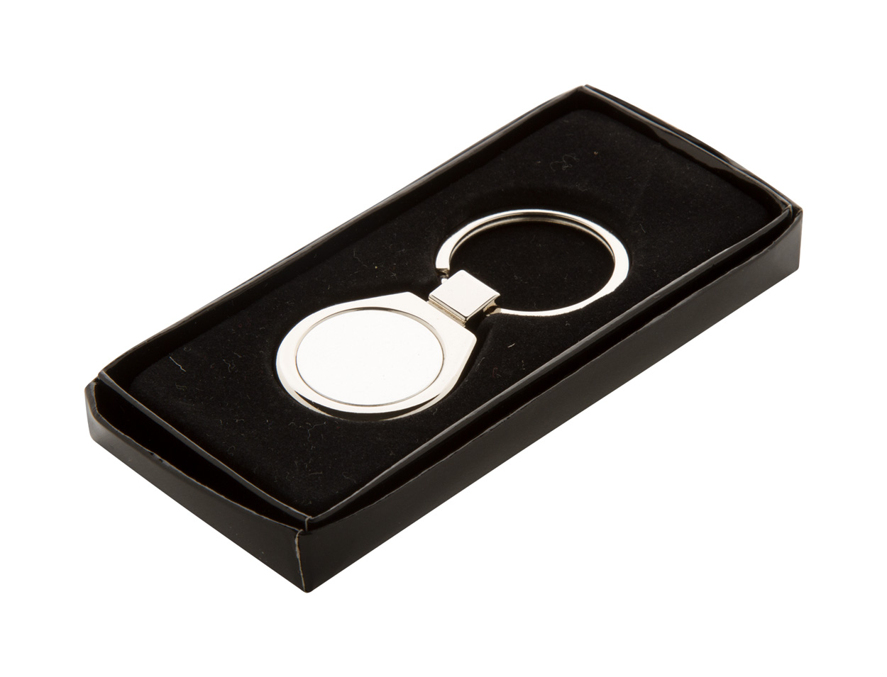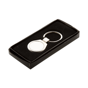 Kovový přívěšek na klíče v krabičce z černého kartonu.
