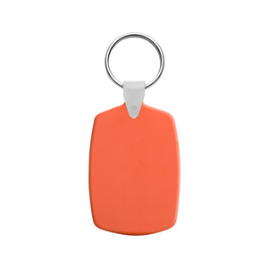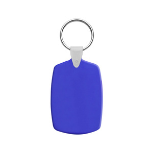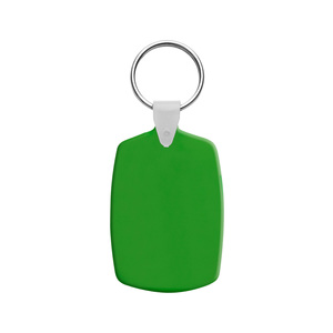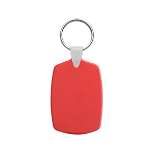 Plastový obdélníkový přívěšek na klíče s kovovým kroužkem.
