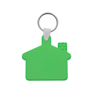 Plastový přívěšek ve tvaru domečku s kovovým kroužkem.