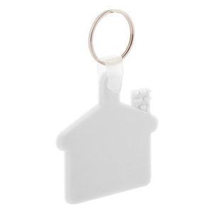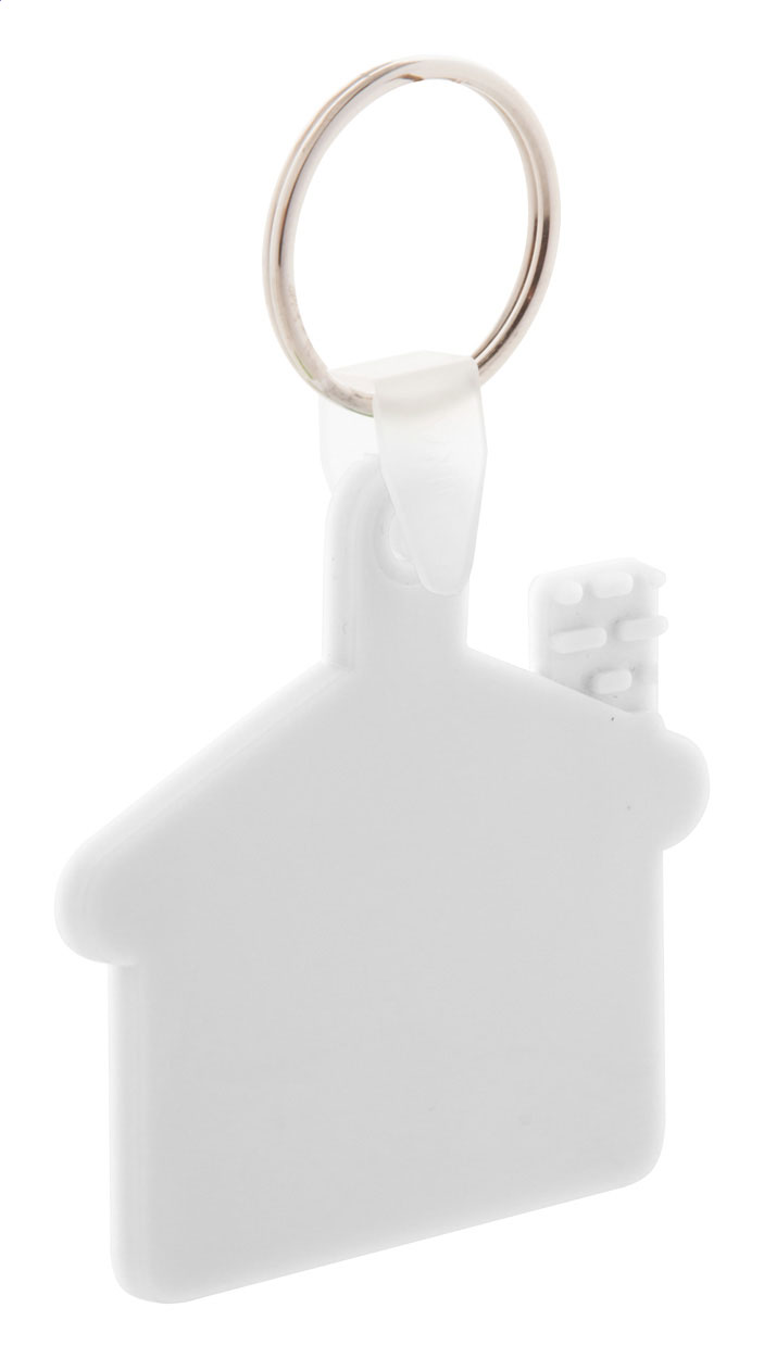 Plastový přívěšek ve tvaru domečku s kovovým kroužkem.