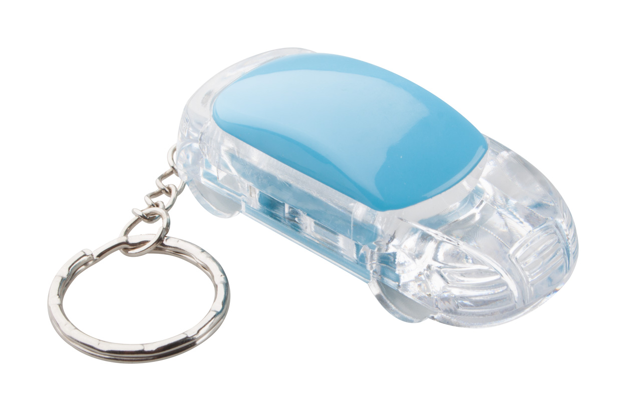 Plastový přívěšek na klíče ve tvaru auta s 1 LED diodou a kovovým kroužkem, vč. knoflíkové baterie.