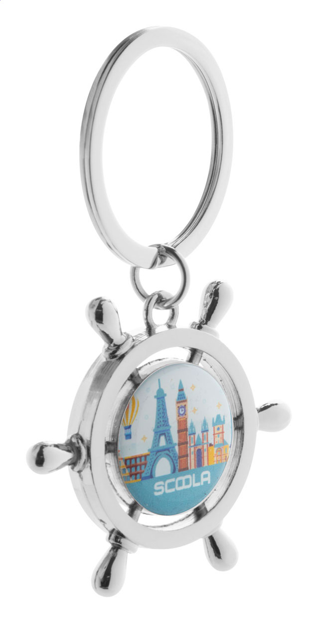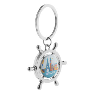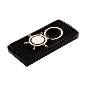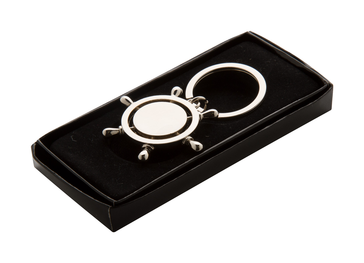 Kovový přívěšek na klíče ve tvaru kormidla, v černé dárkové krabičce.