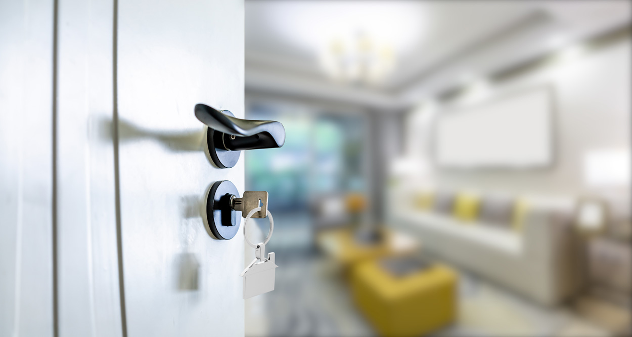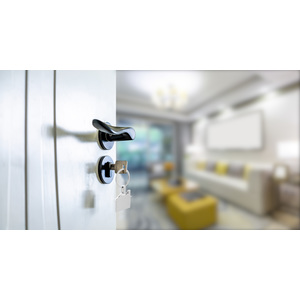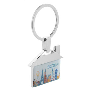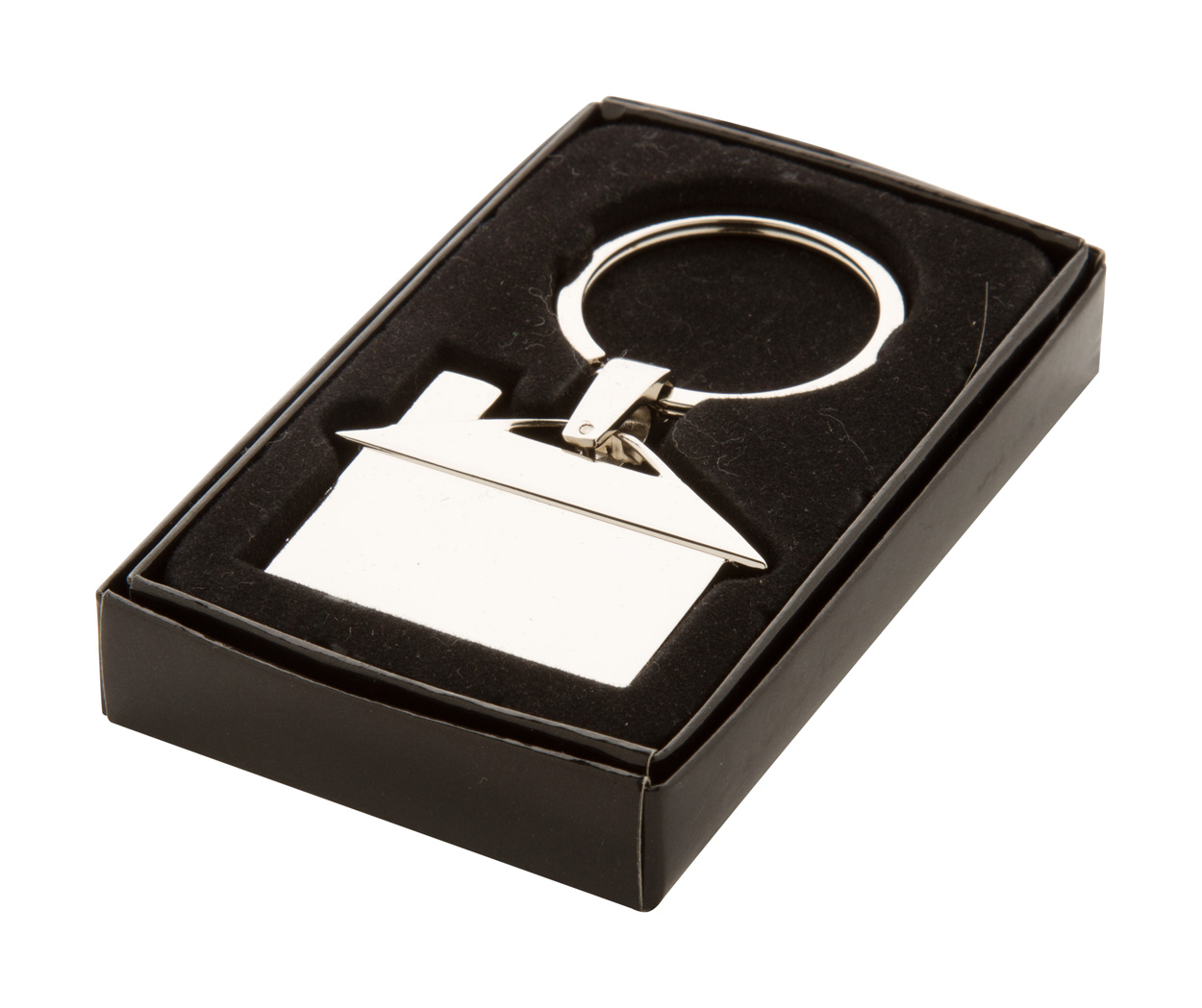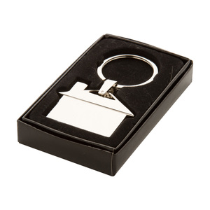 Kovový přívěšek na klíče ve tvaru domečku, v černé dárkové krabičce.
