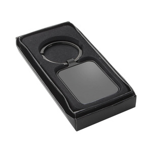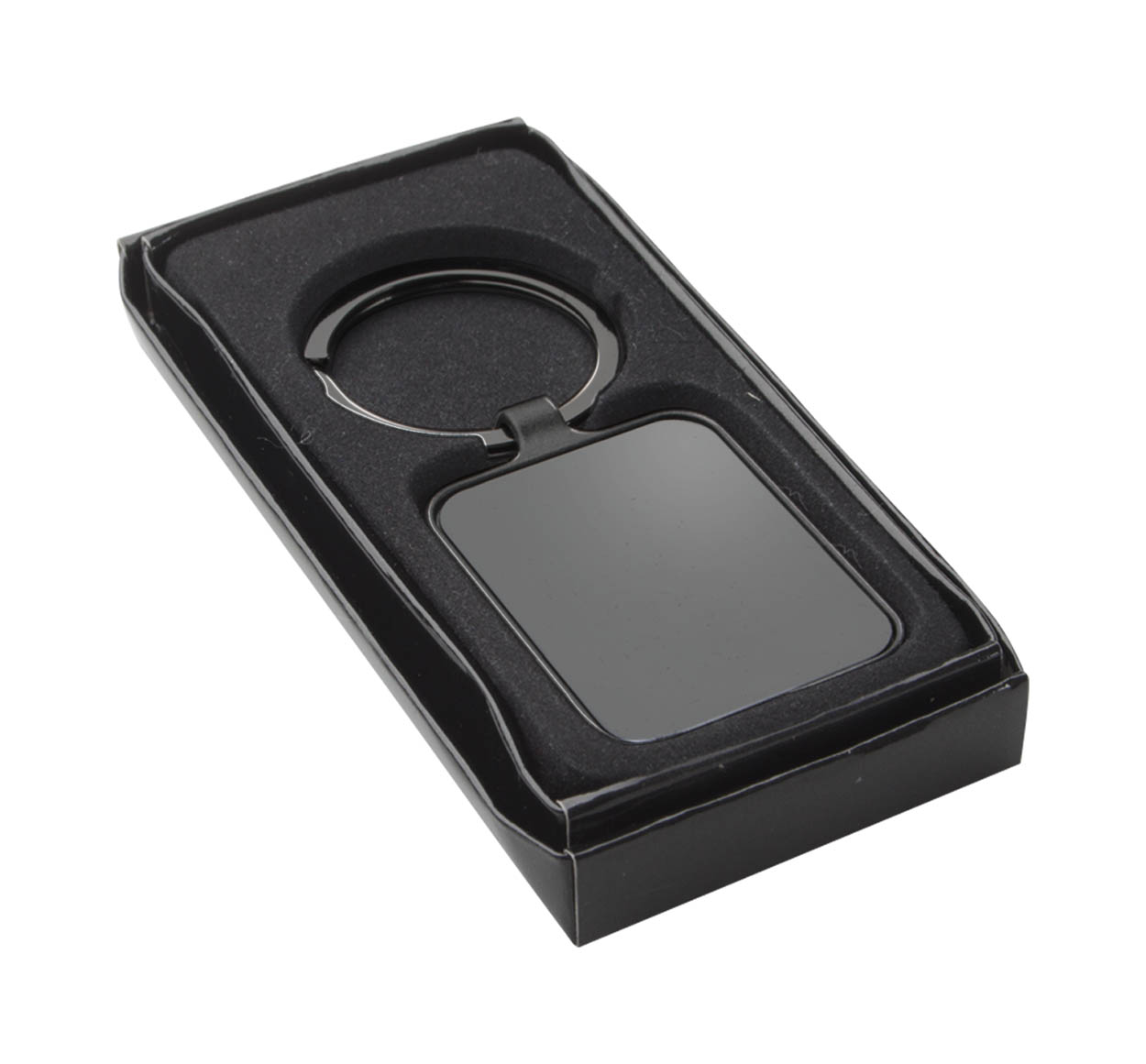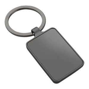 Obdélníkový přívěšek na klíče v barvě gun metal s oboustranným lesklým povrchem.
