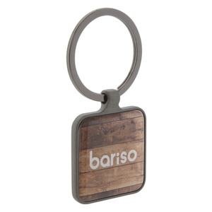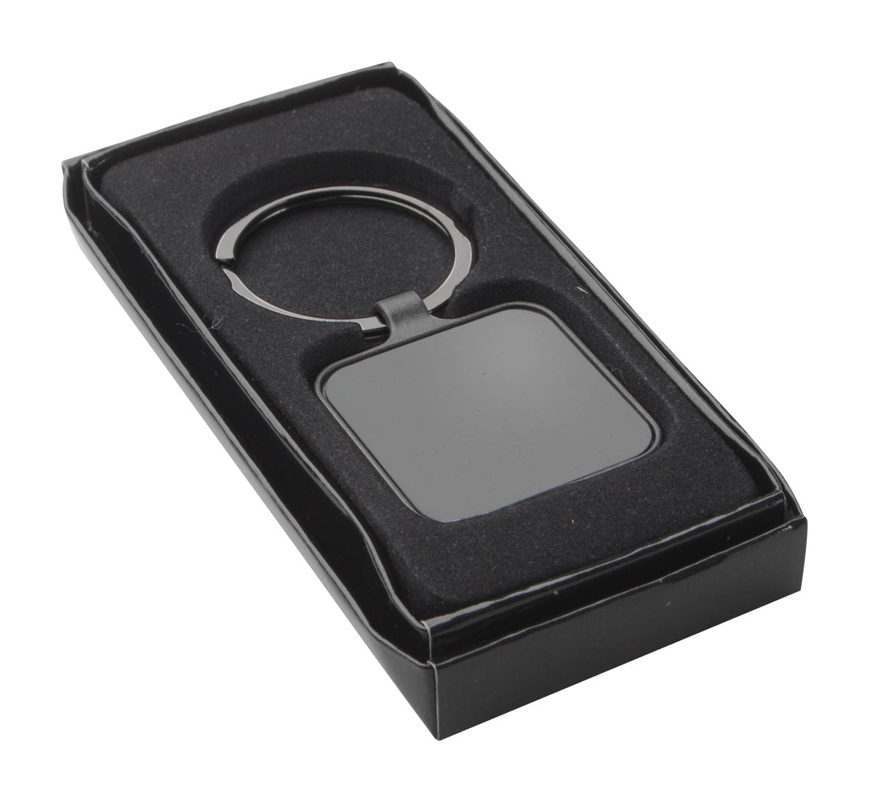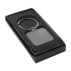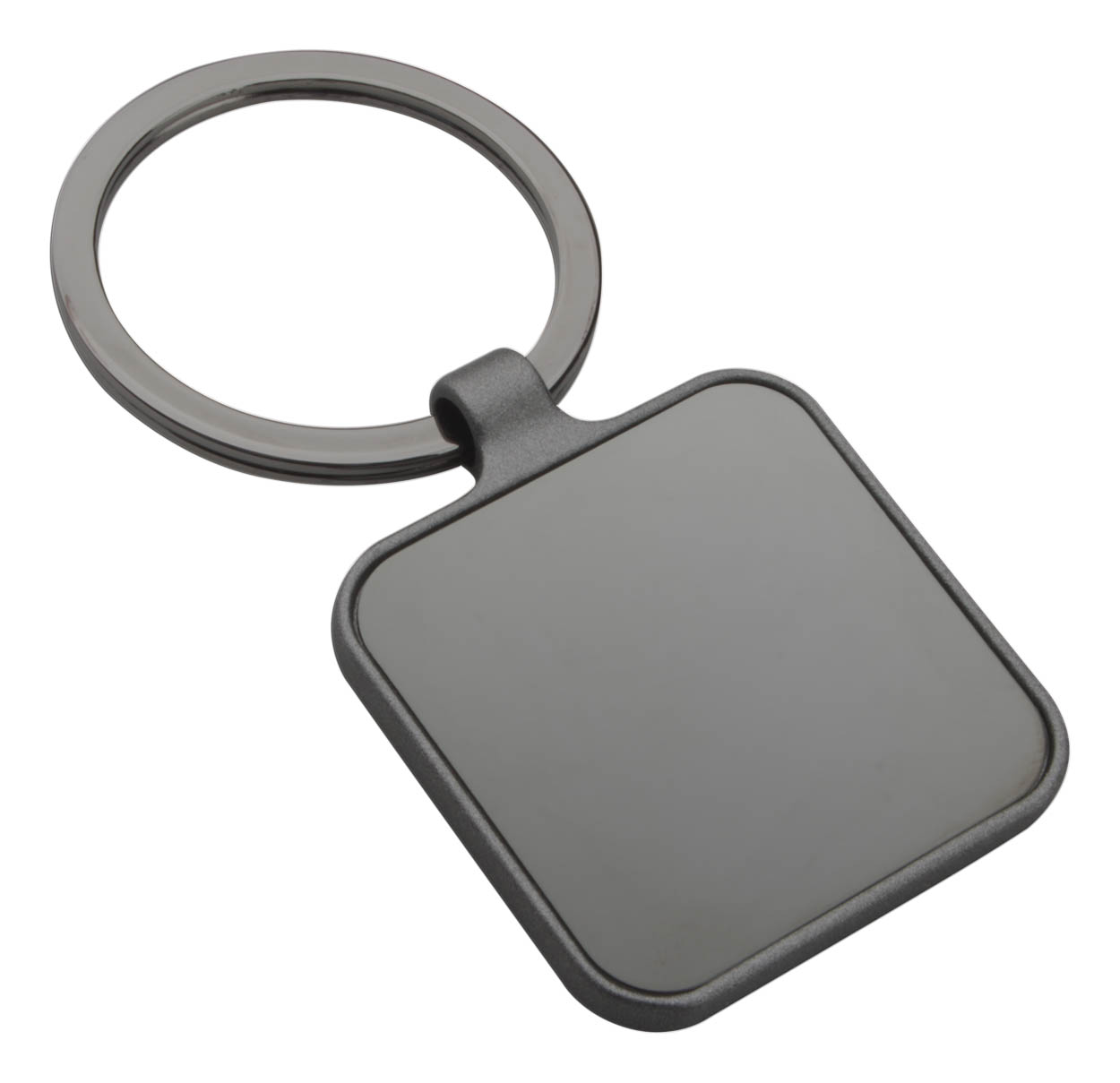 Čtvercový přívěšek na klíče v barvě gun metal s oboustranným lesklým povrchem.