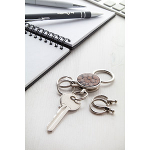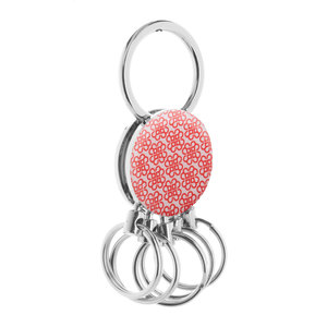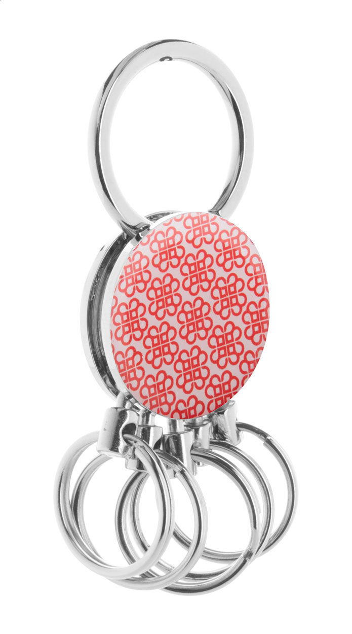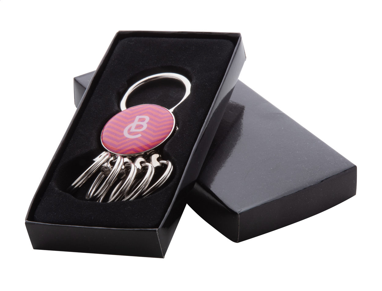 Kulatý kovový přívěšek na klíče s 5 odnímatelnými kroužky, v černé dárkové krabičce.