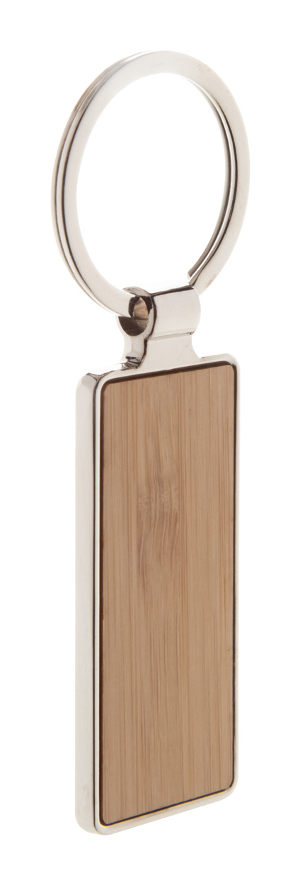 Kovový přívěsek na klíče obdélníkového tvaru s bambusovou vložkou. V kraftové papírové krabičce.