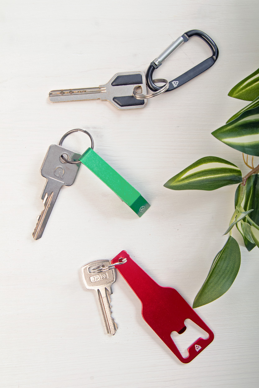 Karabina z recyklovaného hliníku s kovovým kroužkem na klíče.
