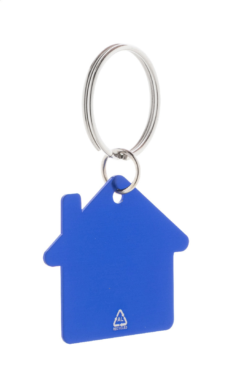 Přívěšek na klíče ve tvaru domečku z recyklovaného hliníku s kovovým kroužkem.