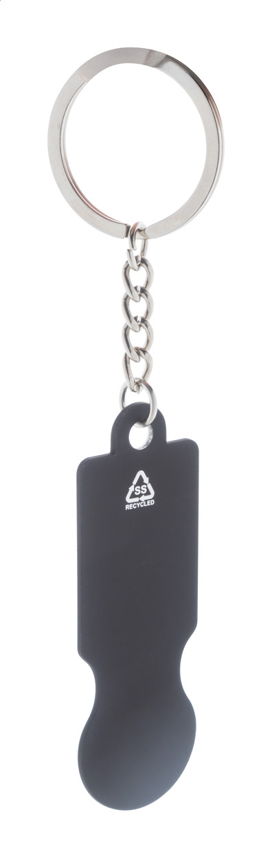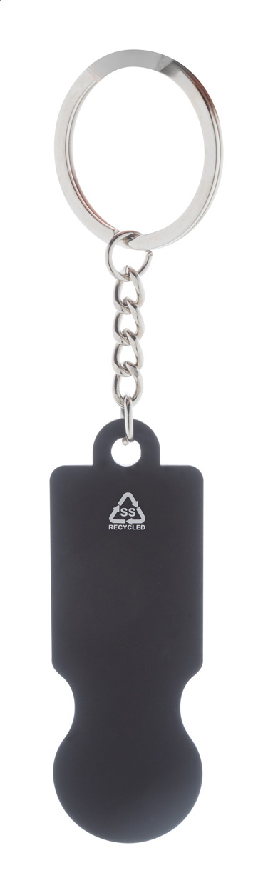 Přívěšek na klíče z recyklované nerezové oceli s pogumovaným povrchem a žetonem do nákupního vozíku. Se speciální vrstvou pro zrcadlové laserové gravírování.